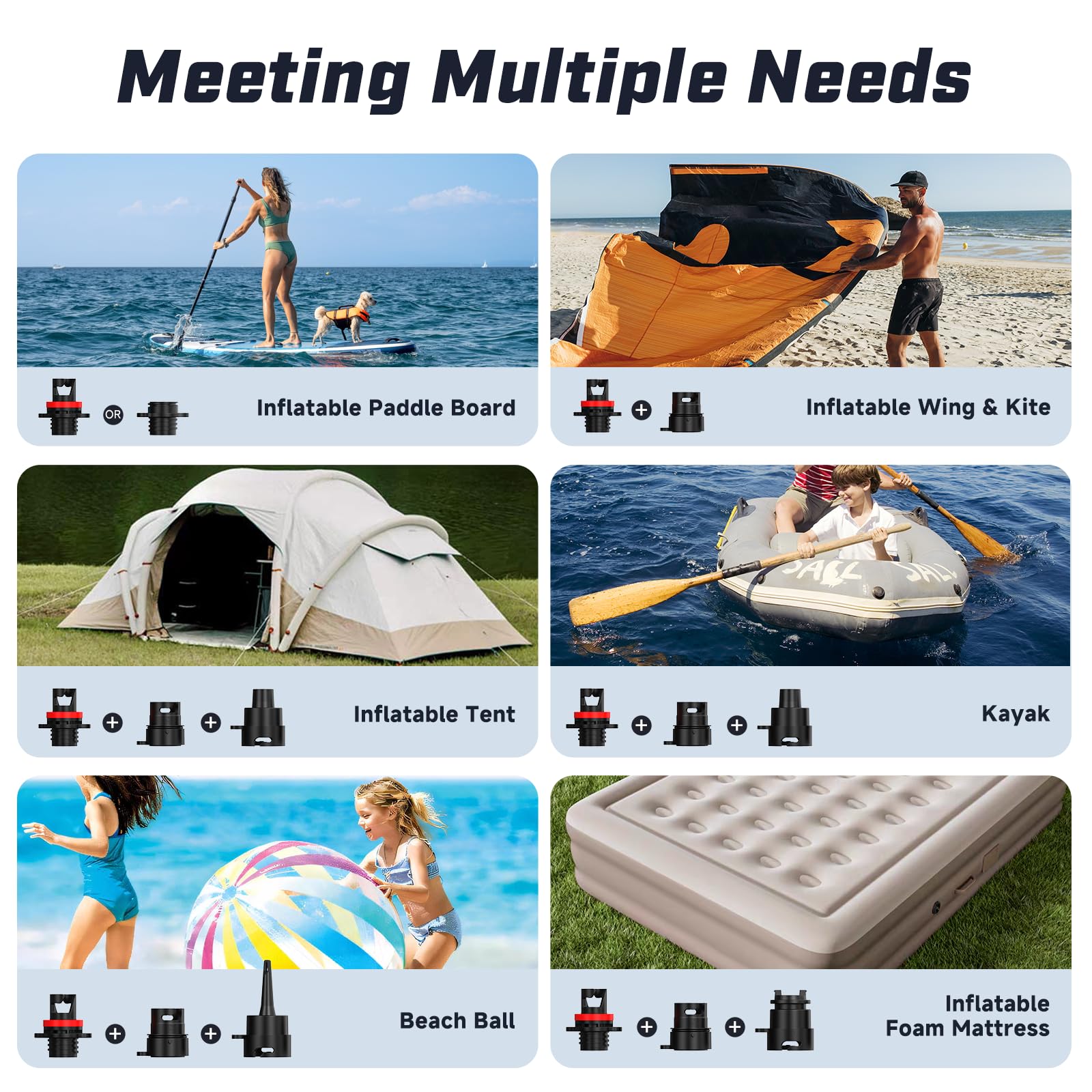 WIDE RANGE OF APPLICATIONS. Equipped with 7 nozzles, our battery pump suits all inflatable devices – paddle boards, beds, kayaks, boats, tents, and swim rings. One pump, endless possibilities. Dive into any adventure with ease!