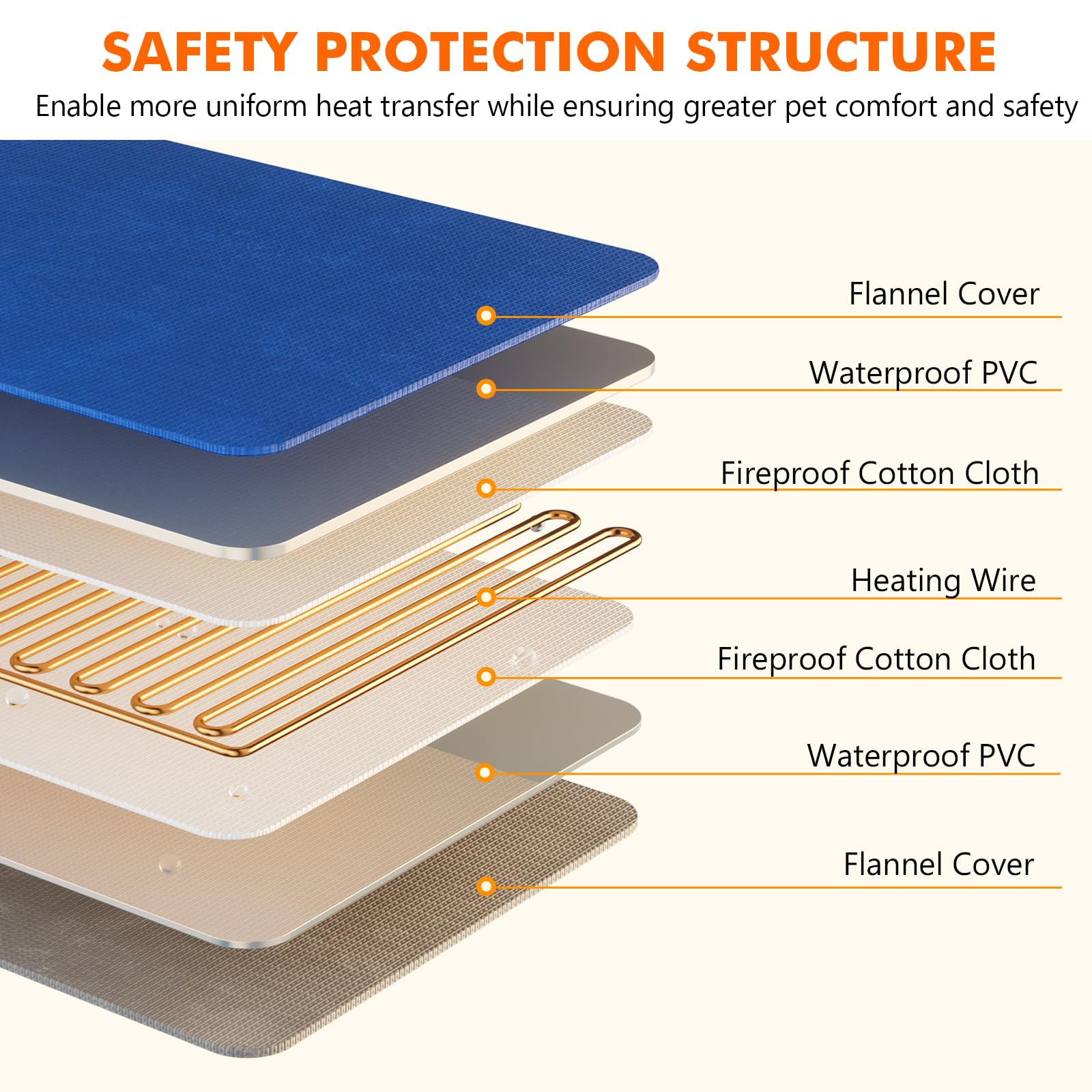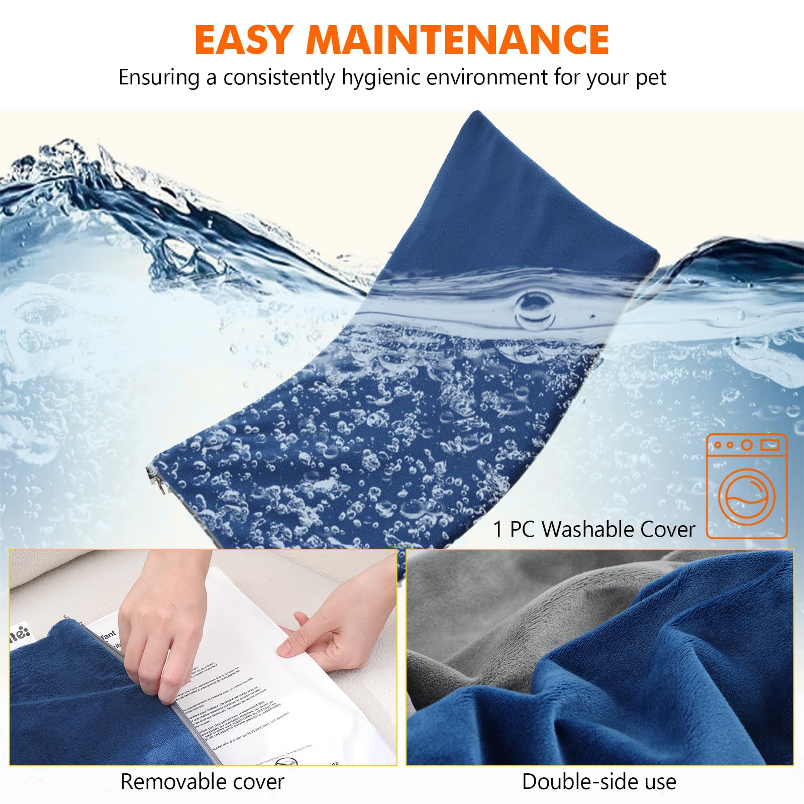 ["DIGITAL DISPLAY WITH 6 ADJUSTABLE LEVELS - The heating pad features a digital display that precisely shows and allows you to adjust both the temperature and heating time. You can set the temperature in 6 levels (30/35/40/45/50/55℃) and the heating duration (2H/4H/8H/12H/24H/continuous).", "DOUBLE-SIDED AND COMFORTABLE FABRIC - Our heating pad provides cozy warmth and is user-friendly with its double-sided design. The pleasant feel ensures that your pet always feels comfortable, no matter which side it lies on.", "SAFE MATERIAL - Specifically designed to ensure the well-being and safety of your furry companion. To ensure your pet's safety, the heating pad has an overcurrent protection that prevents overheating. It is also made of flame-resistant material, which provides additional safety.", "BITE-RESISTANT HOSE - The electrical wires of the heating pad are protected by a special bite-resistant metal hose, wrapped in multiple layers. This prevents your pet from chewing through the cable and causing an electrical hazard. Making the product durable and safe, even if your pet likes to nibble or bite things.", "REMOVABLE AND MACHINE-WASHABLE FABRIC COVER - For easy cleaning and maintenance, the heating pad comes with a removable fabric cover. The cover can be washed in the washing machine, ensuring that the pad stays hygienic and clean." ]
