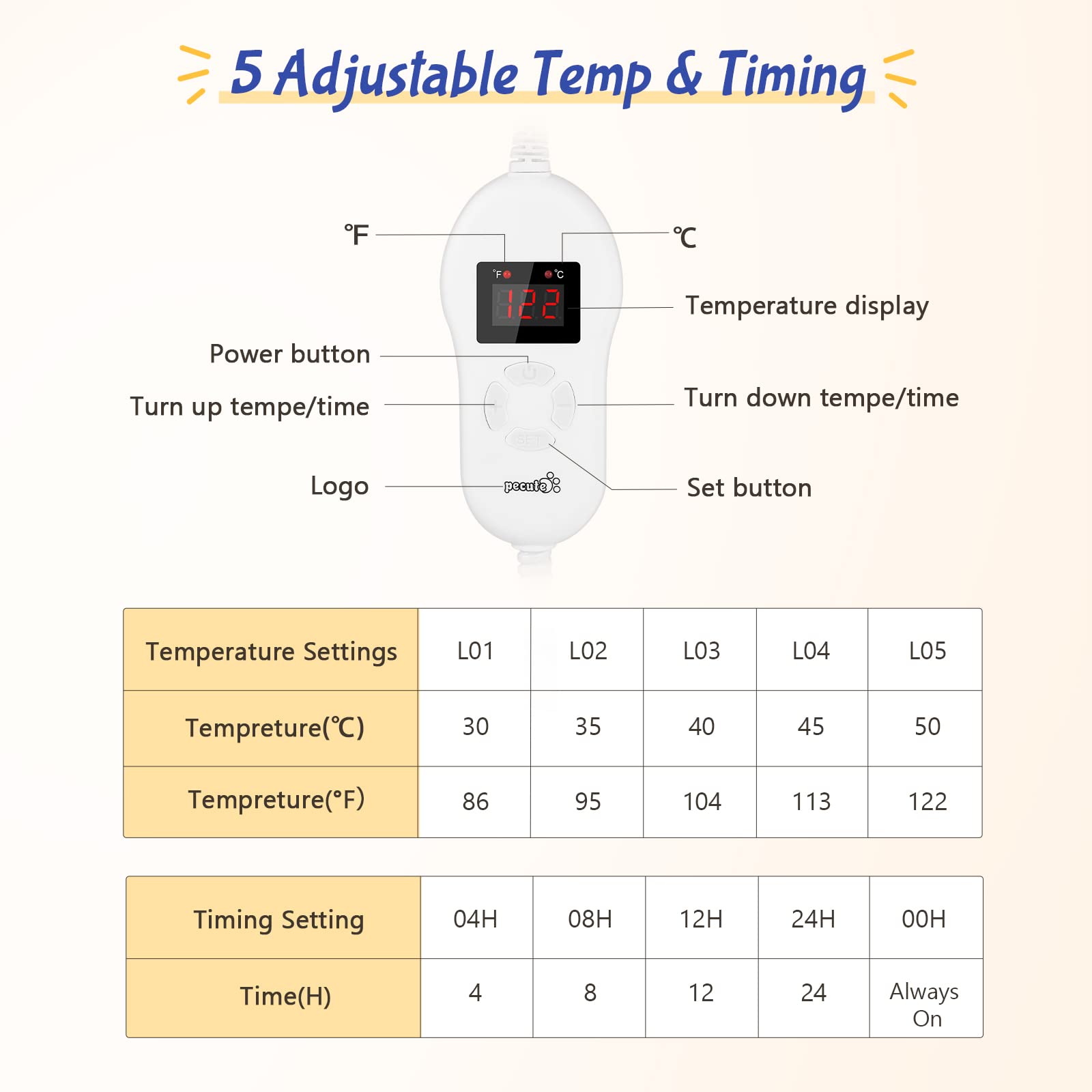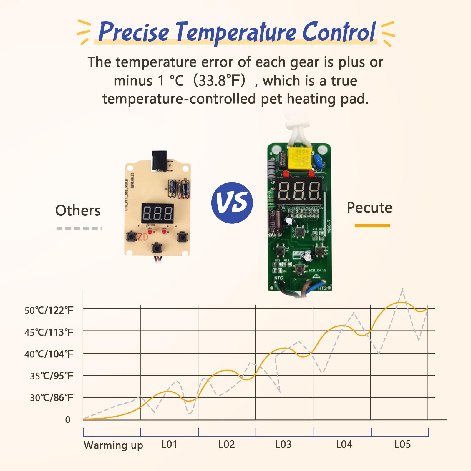 5 temperatures to choose from. Depending on the season and environment, we need to provide different temperatures for pets. The heating pad is equipped with a temperature controller. There are 5 levels to choose from: 30°C (86°F) / 35°C (95°F) / 40°C (104°F) / 45°C (113°F) / 50°C (122°F). The temperature error is plus or minus 1°C."