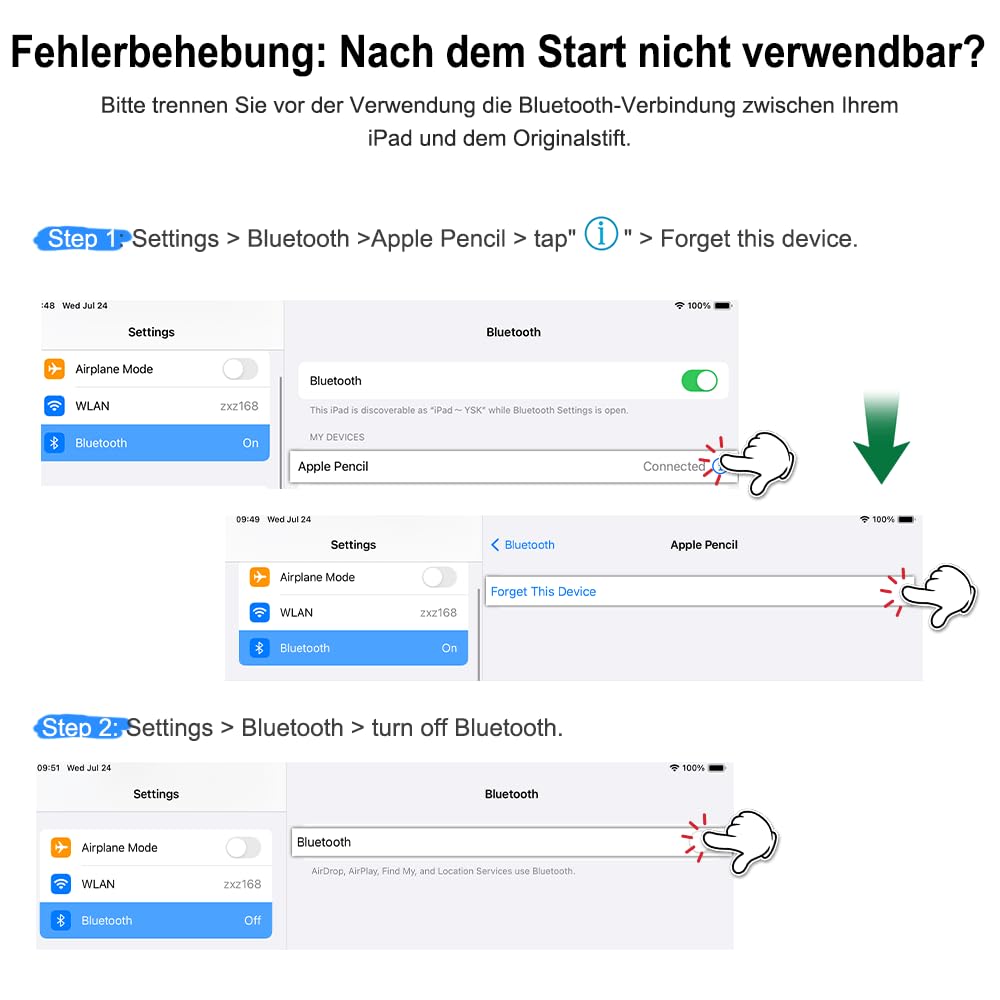 "TROUBLESHOOTING: NOT USABLE AFTER START - Before use, please disconnect the Bluetooth connection between your iPad and the original stylus: ① Disable Apple Pencil exclusivity: Settings > Apple Pencil > turn off "Allow only drawing with Apple Pencil". ② Delete paired devices: Go back to Settings > Bluetooth > Tap on the ⓘ symbol next to your connected Apple Pencil > Select "Forget Device" > Disable Bluetooth."