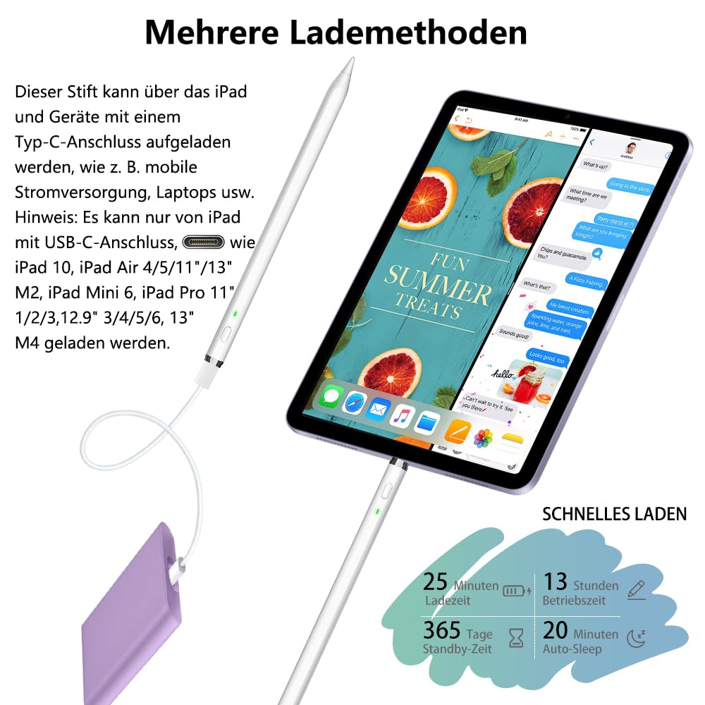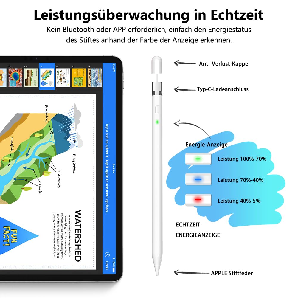 "USB-C FAST CHARGE & INDICATOR LIGHT - It can be charged via iPad and devices with a Type-C charging port and supports fast charging technology: Just 25 minutes of charging provide up to 13 hours of continuous use and 365 days of standby time. A multi-color LED indicator clearly shows the battery status: green light (100%-70%), blue light (70%-40%), and red light (40%-5%), so you're informed at a glance."