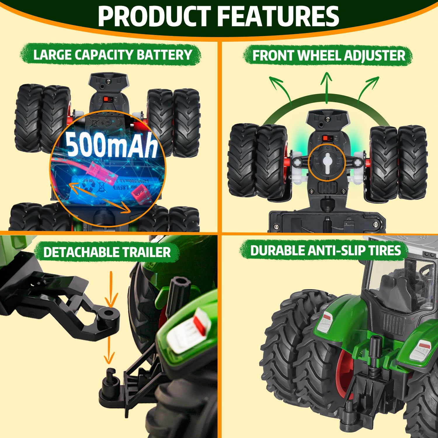 ["DIY Own Farm"]This remote controlled tractor is a toy set with detachable parts, including a front loader and trailer. Young farmers can attach the trailer to the back of the tractor and load hay bales or different animals (cows, sheep) onto the trailer for transport on the farm. This remote controlled tractor not only satisfies the children's play needs but also helps them develop their practical skills and imagination.