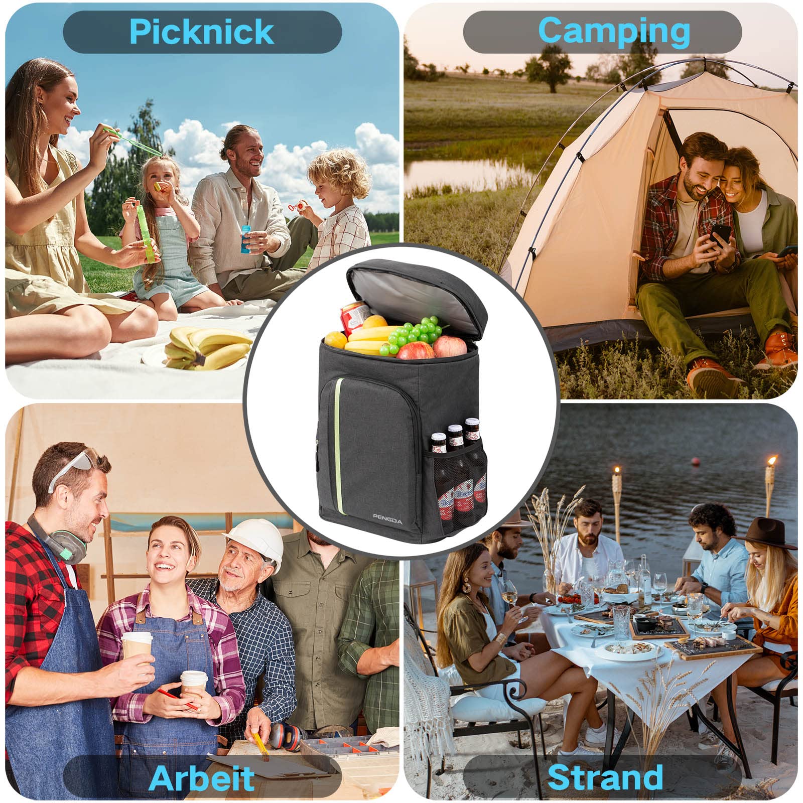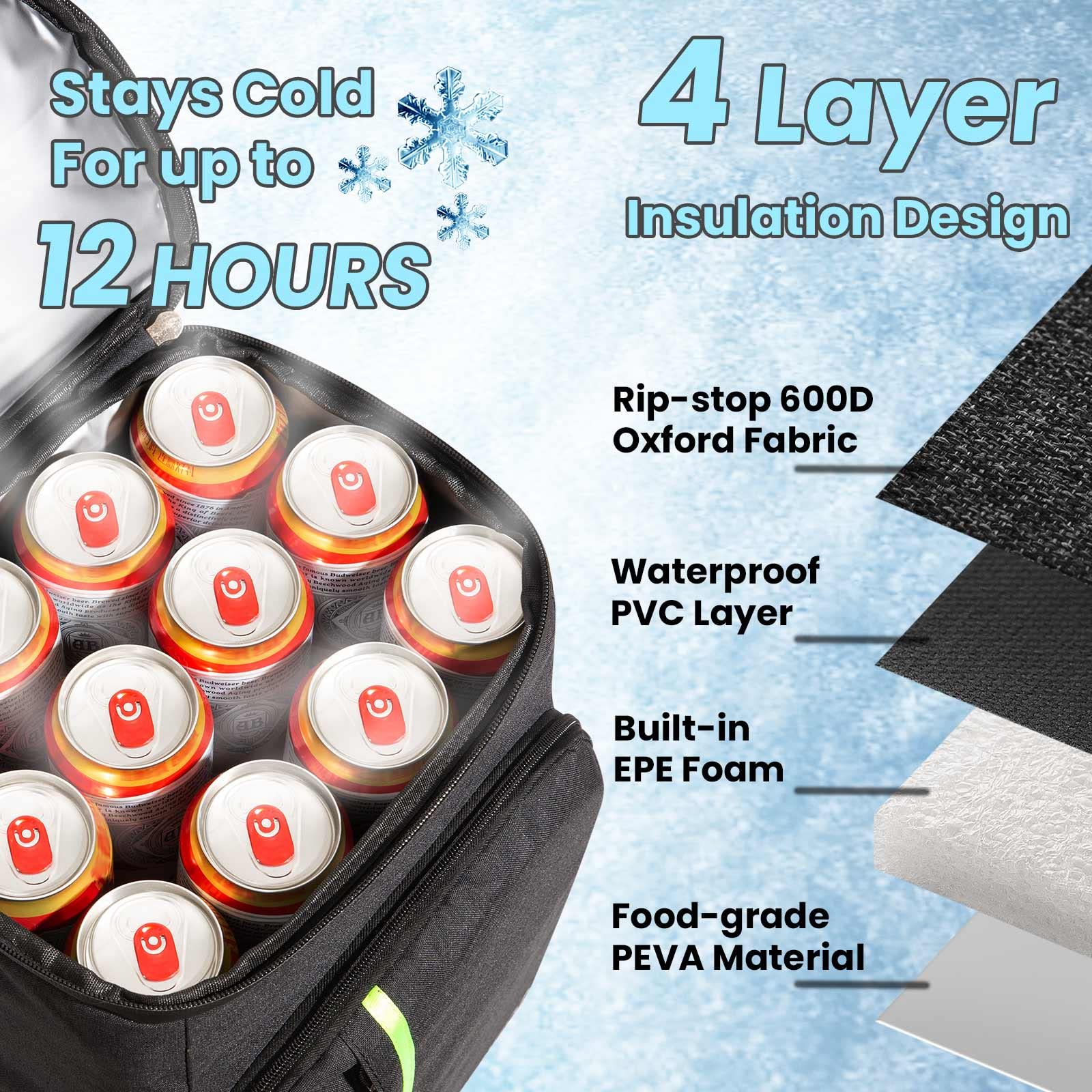 "The contents of the bag stay warm or cold and the bag is leakproof: The PEVA inserts on all sides keep the backpack cold or hot for hours, depending on the contents. High-quality, waterproof zippers ensure a dirt-repellent exterior. The high-density insulation material and leak-proof PEVA liner prevent any leaks in the worst case scenario. Your snacks or drinks will stay cool for up to 16 hours at temperatures below 15 °C.