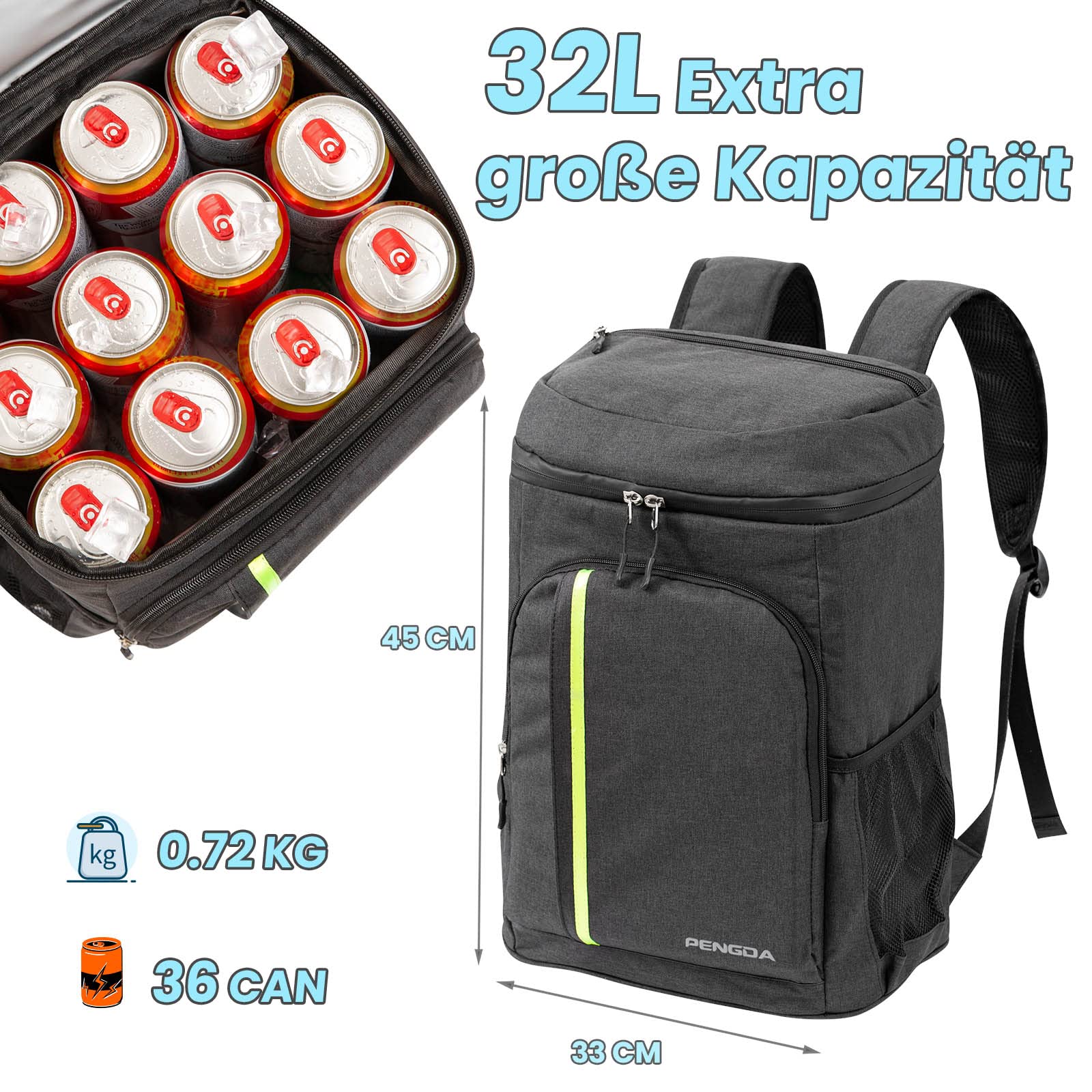 Large capacity: 32 liters; Dimensions: 13.0" x 7.5" x17.7" / 33 cm x 20 cm x 45 cm (L x W x H); Weight: 800 grams. Spacious enough to securely store meals, beer, snacks, drinks, towels, cell phones, and similar everyday items. Easy to clean both inside and out. Long-lasting cooler bag for beach picnics, family vacations, camping, walks, hiking, or similar activities.