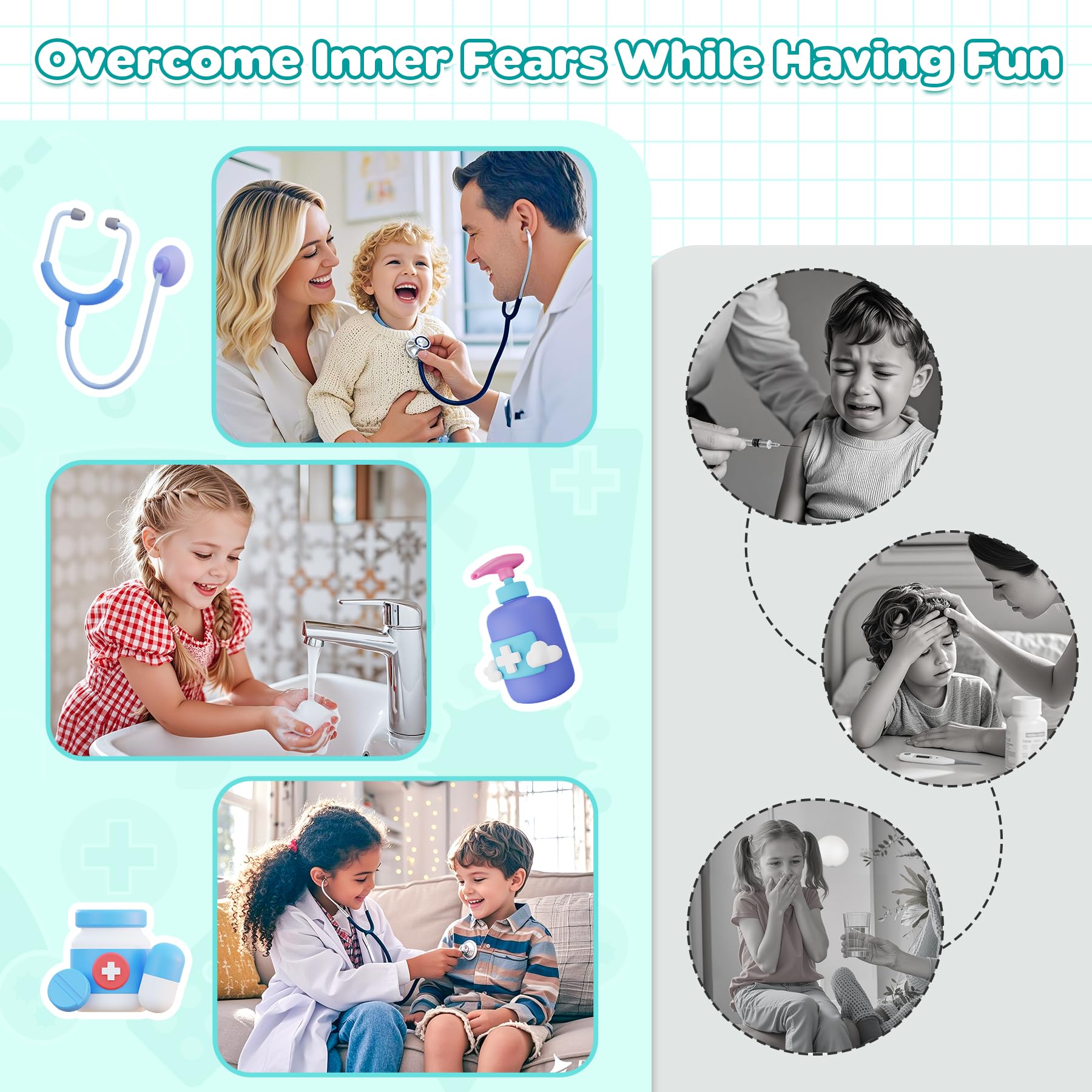 ["Our doctor kit for kids stethoscope stands out from the competition by offering a truly authentic heartbeat listening experience. Without the distraction of lights, it focuses solely on reproducing the most realistic heartbeat sounds. This allows children to immerse themselves deeper into doctor-patient role play and ignite their curiosity and love for medical exploration."]