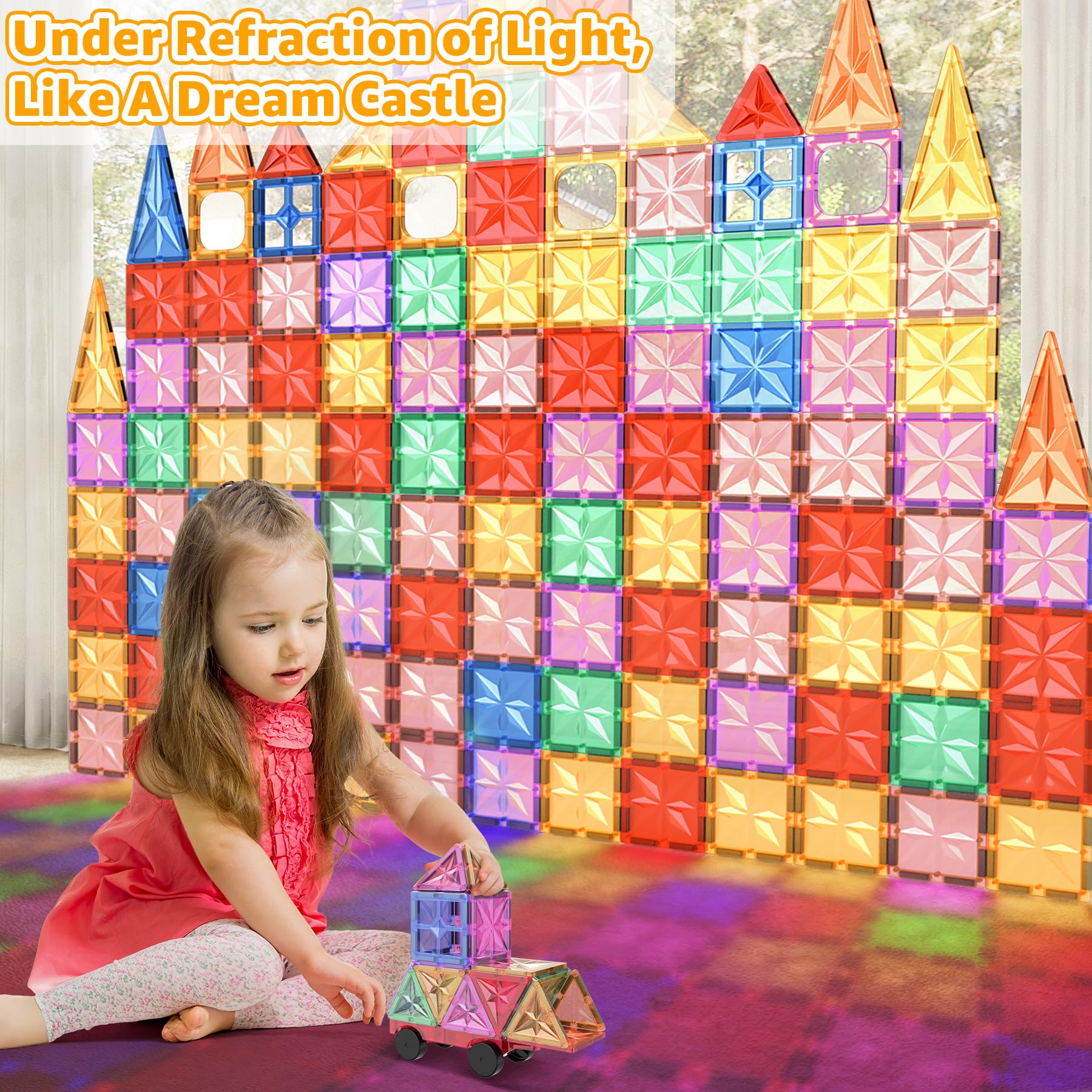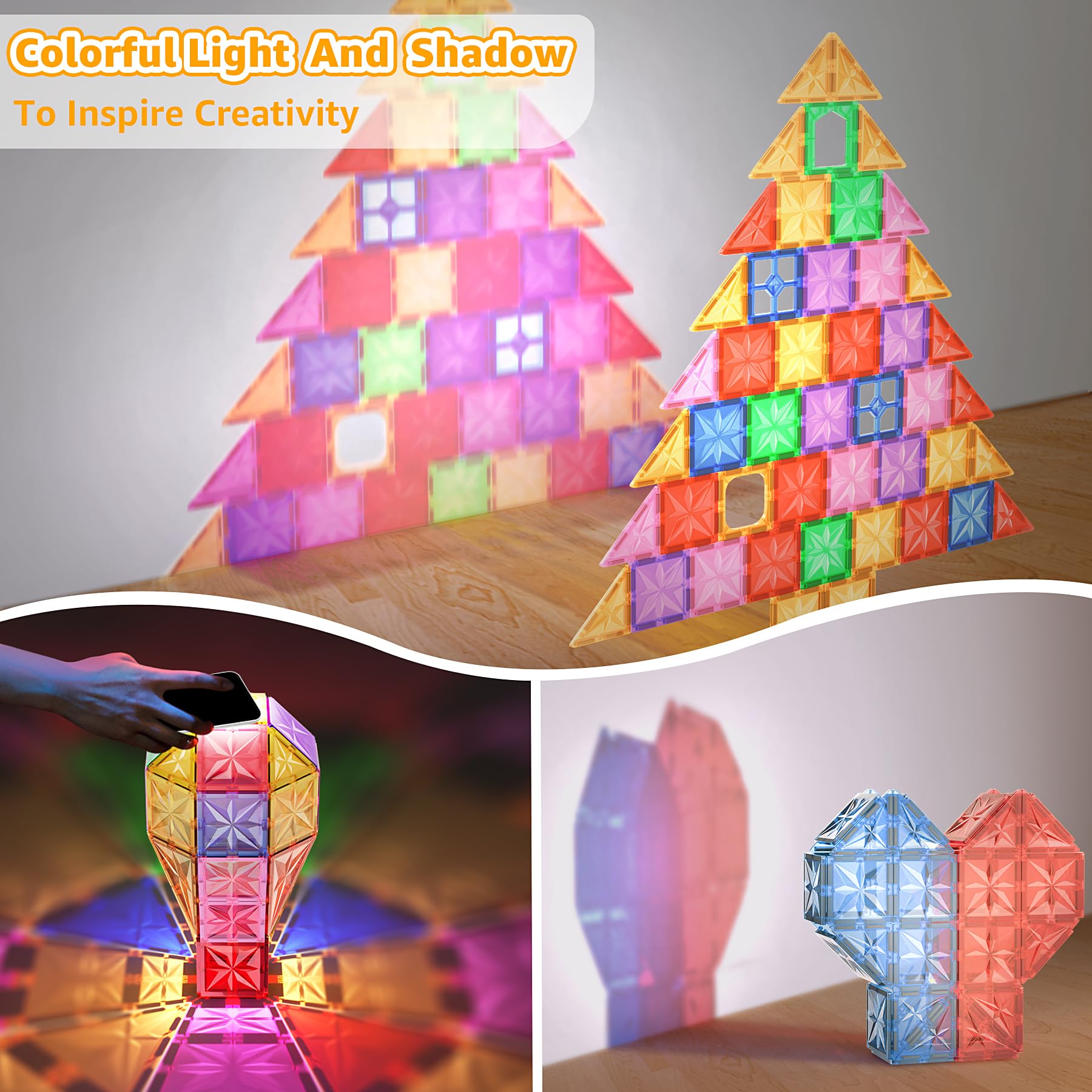["【More parts for endless creativity】With 61 pieces, our set provides plenty of magnetic building blocks for creating a variety of 2D and 3D shapes. From simple geometric designs to complex structures like castles and animals. This allows for more variety and possibilities for building and designing.","【Compatibility and strong magnetism】Our magnetic building blocks are designed to be fully compatible with other magnetic building blocks, providing unlimited building possibilities. Each tile is equipped with strong magnets that ensure a stable and secure connection. The tiles have smooth, rounded edges, making them safe for little hands. Children can confidently build.","【Magical color reflections】Have you not experienced the magic of our magnetic building blocks yet? They feature highly transparent, rich rainbow colors. These vibrant tones not only stimulate children's imaginations but also reflect stunning patterns when illuminated by sunlight during the day or indoor lighting at night, providing a fascinating playing experience.","【Perfect for STEM learning & parent-child fun】Promotes fine motor skills, spatial thinking, and teamwork - educators recommend magnetic building blocks for early childhood education. Parents build alongside: strengthen bonding through shared play!","【The perfect gift for joy and learning】Give the gift of endless fun and educational play. Ideal for birthdays, holidays, school classrooms, teacher and educational supplies. Encourage children to play indoors and during breaks. Suitable for all ages, a great choice for fun group games. It can also be used as a complement to other magnetic toys for children. Comes in a beautiful box with instructions"]