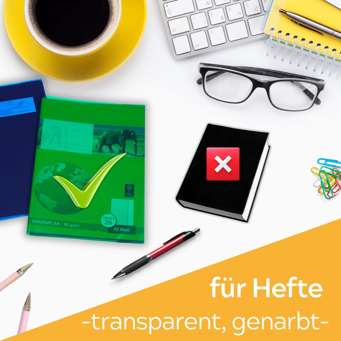 "Strong Features: sturdy protective cover, foil thickness of 0.09 mm (90 microns), environmentally friendly, recyclable PP plastic material, capacity for 16-32 sheets / max. 48 sheets, MADE IN EU","Ideal Format: notebook cover with a page size of 212 x 297 mm, dimensions when open 426 x 297 mm, for notebooks & books (soft cover) in DIN A4 size, with practical notebook binding (47 mm), flexible & wipeable","Colors: 10 sets of 25 colorful covers, 5 different colors (5 x yellow, red, green, blue, transparent), good visibility of designs & text through transparent plastic film, colored-transparent, textured","Perfect Protection: notebook / book cover as an effective helper for protecting school, work notebooks, binders, book boxes, books from dust, dirt, moisture, creases, tears & dog ears","Versatile Use: durable cover with easy handling for school, home, home office, college, university as well as in the office"