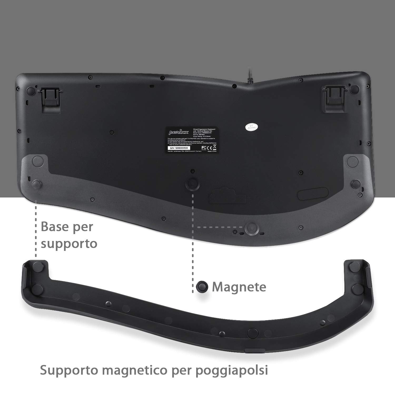 "Ergonomic keyboard and mouse with Italian layout, specially designed to reduce hand pressure during computing and give you the advantage of easy and relaxed typing. Ergonomic 3D keyboard with split design featuring 12 multimedia functions and quick access keys, with an additional scroll wheel adjustable in 4 positions. With its slim, natural arch shape and integrated adjustable wrist rest promoting a neutral wrist position to prevent carpal tunnel syndrome and RSI. Ergonomic wired vertical mouse with 5 button design and adjustable 1000/1600 DPI resolution; the cable length for keyboard and mouse is 1.8 m. System requirements: Windows 7, 8, 10; easy installation with plug and play, no drivers required; Package includes: 1 x keyboard, 1 x mouse, 1 x wrist rest, 1 x mobile magnet. Limited 24-month warranty."