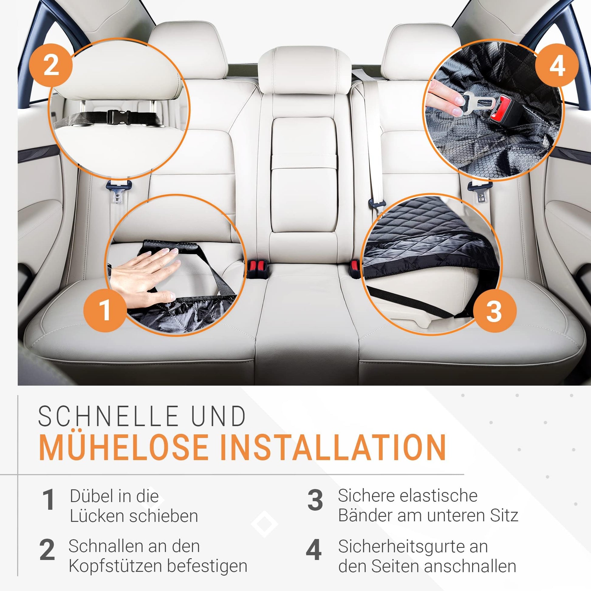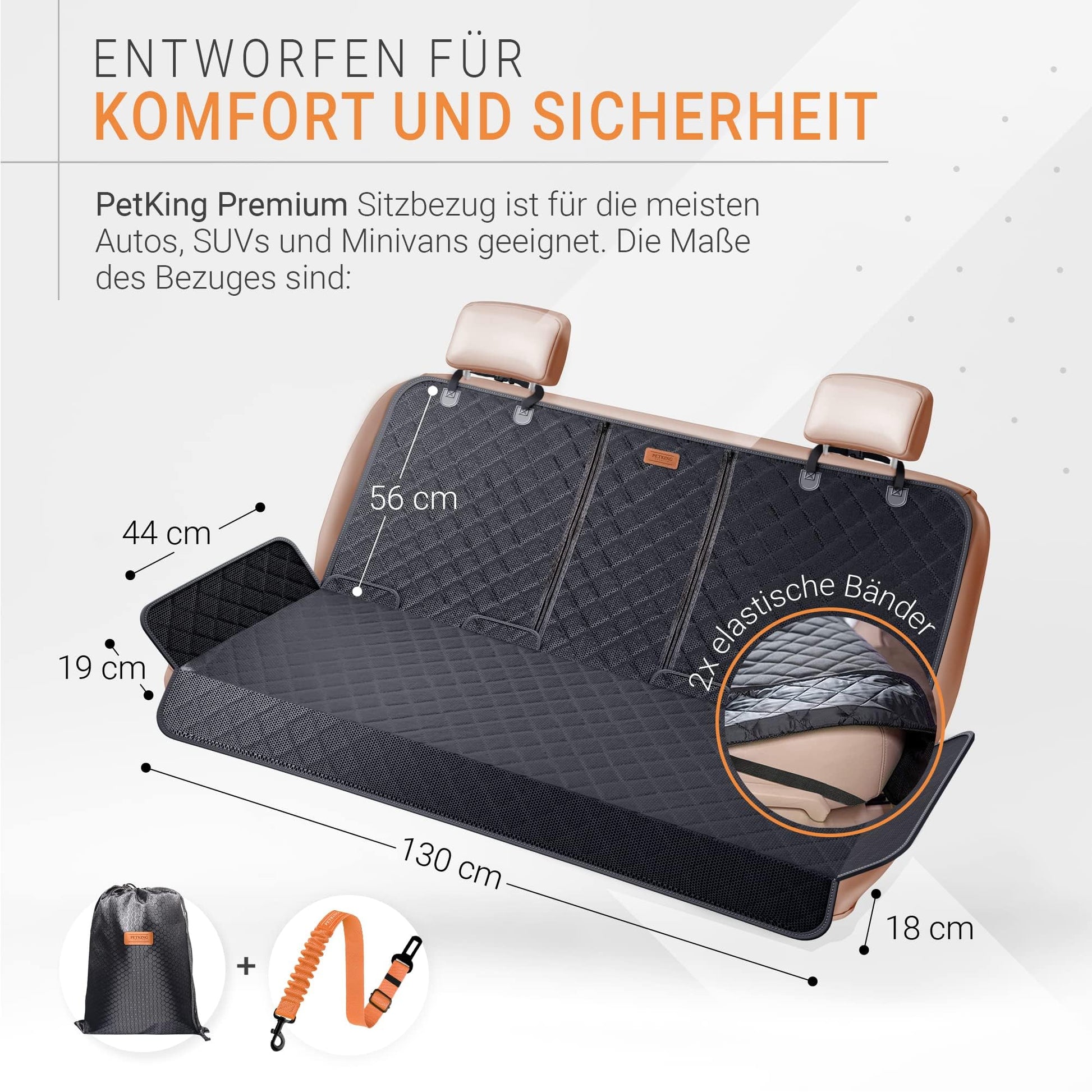 ["Hot pressing technology: The layers of the PetKing dog car seat cover are connected with an innovative heat pressing technique that leaves no seam holes. No seam holes - no water leakage! The heat-pressed layers provide better water resistance and therefore better protection for your car interior. Experience better quality with PetKing Premium! The dog car seat protector!","Soccer pattern and non-slip bottom: PetKing Premium cover with luxurious soccer pattern coating has superior benefits - hair does not get stuck between the material. It is easy to clean as hair can be brushed or vacuumed off! To keep the dog car seat cover in shape, the non-slip bottom helps. The rubber material prevents the cover from slipping. Everything stays in place while the dog moves!","Universal size for rear seats: Our dog car seat cover for rear seats is suitable for most cars, SUVs, and minivans. The dimensions indicate the size of the cover, and it has adjustable straps that can be tailored to the size of your car! With the additional leash, you can ensure your dog's safety and use the storage bag to conveniently store the cover in a desired location!","Share the car seat cover with your dog and family members: The PetKing Premium bench seat cover is suitable for everyone! The cover is designed to provide safety and comfort and can be used jointly by your dog and passengers. Create memories with your entire family!","Safe, smart, and lightweight design of the dog car rear seat: The cover has built-in zippers to move the armrest for passengers to ride more comfortably. The openings for the seat belt and the slots are provided with tapes to prevent liquid leakage, and the seat anchors keep the cover in place. Protect your car interior and make it look luxurious with PetKing Premium!"]