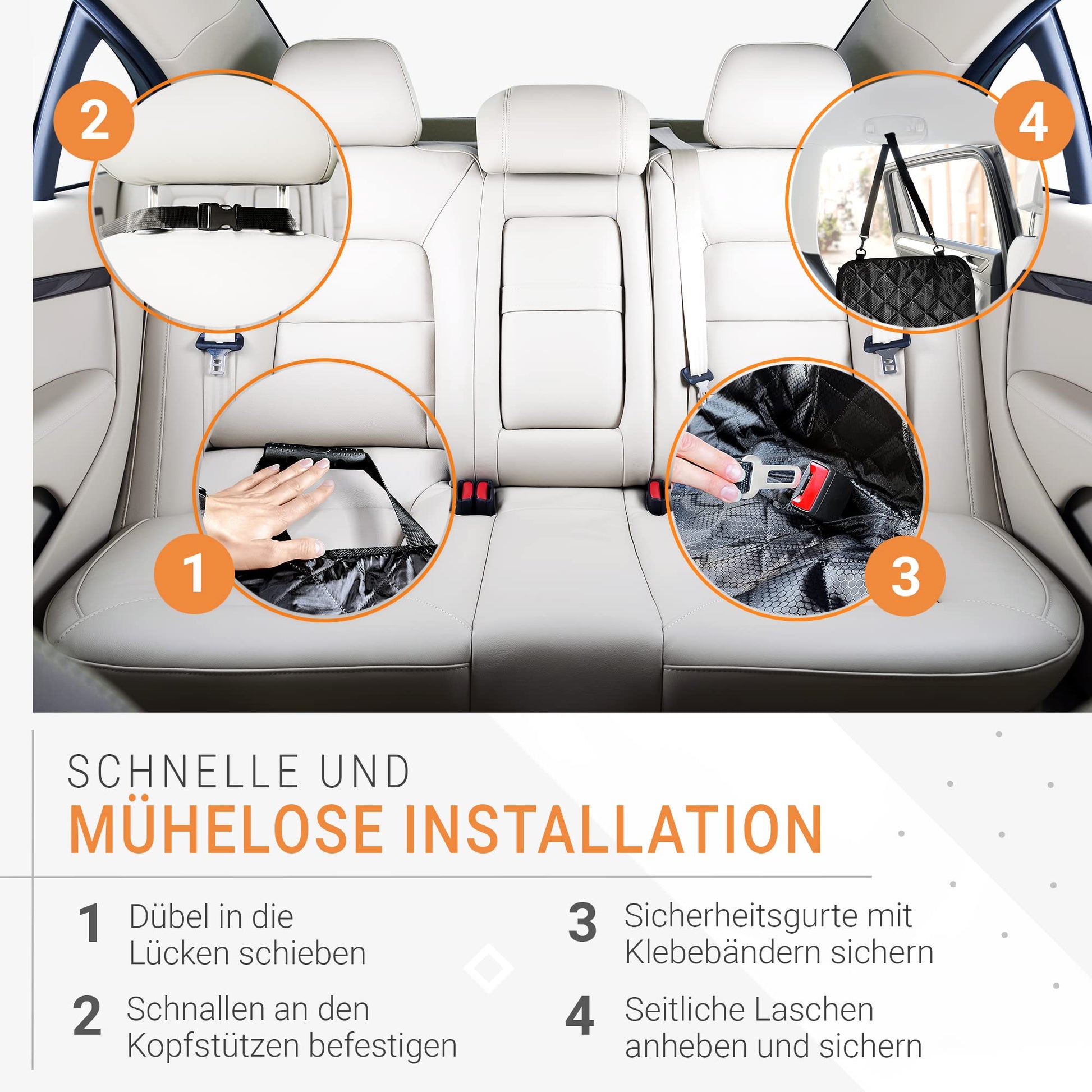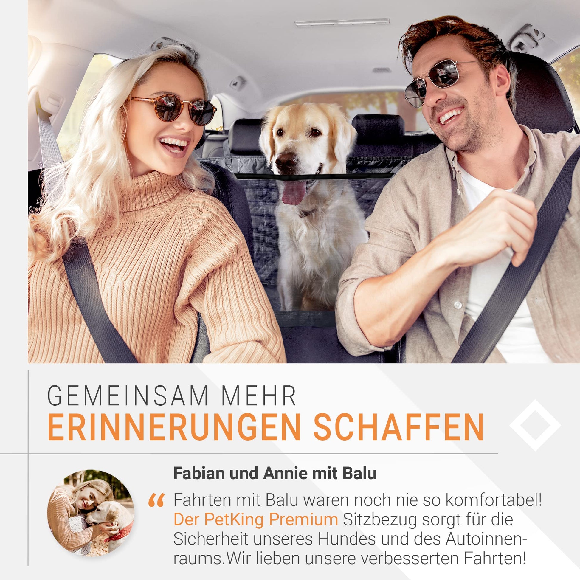 ["Hot Pressing Technology: The layers of the PetKing Premium car seat cover are connected with the innovative heat pressing technology, which leaves no seam holes. No seam holes - no water leakage! The heat-pressed layers provide better water resistance and therefore better protection for your car interior. Experience better quality with PetKing Premium!","Soccer pattern and non-slip bottom: PetKing Premium cover with soccer pattern coating has superior benefits - hair does not get stuck between the material. It is easy to clean as hair can be brushed or vacuumed off! To keep the cover in shape, the non-slip bottom helps. The rubber material prevents the cover from slipping. Everything stays in place while the dog moves around!","Universal size with convertible function car dog blanket: Our car protection cover dog rear seat is suitable for most cars, SUVs, and minivans. The dimensions indicate the size of the cover, and it has adjustable straps that can be tailored to fit your car! Additionally, you can convert it from a rear seat protector for dogs into a bench seat or even place it in your trunk. Also, use a storage bag to keep it neatly packed!","Safe and comfortable dog car rear seat for your Dog: 6 strap attachments, seat anchors in the interior, and an additional leash with strap attachment ensure absolute safety for your dog. This is the dog blanket car rear seat detachable. Through a built-in mesh window in the middle, you can always monitor his well-being, and when the puppy gets thirsty, you can use the collapsible bowl that comes with the cover!","All-around protection for the rear seats dog rear seat protection: The front and back flaps of the car seat cover dog cover the rear seats and the back of the front seats, while the side flaps protect the doors additionally. Your four-legged friend can still enjoy the view through the window, while the door material is protected from dirt and scratches. Is there anything else you would like to cover with PetKing Premium? Check out our other products on Amazon!"]