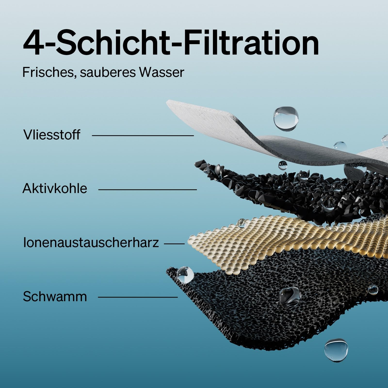 【Vertical Filter System】1. Activated carbon eliminates odors. 2. Ion exchange resin removes heavy metal ions and softens water quality. 3. The non-woven fabric captures cat hair and impurities. 4. The built-in pump sponge filters additional dirt to prevent clogging and damage."