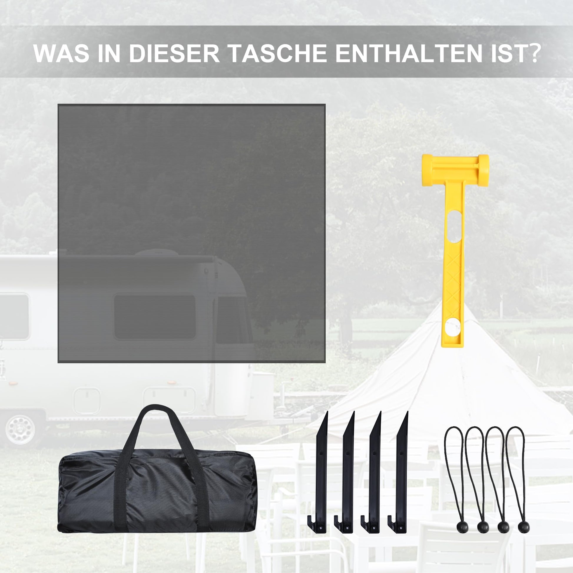 "Package includes: 1 x 8ftx8ft front wall, 4 x adjustable guy ropes, 4 x pegs, 1 x hammer, 1 x carry bag, 1 x setup guide.",