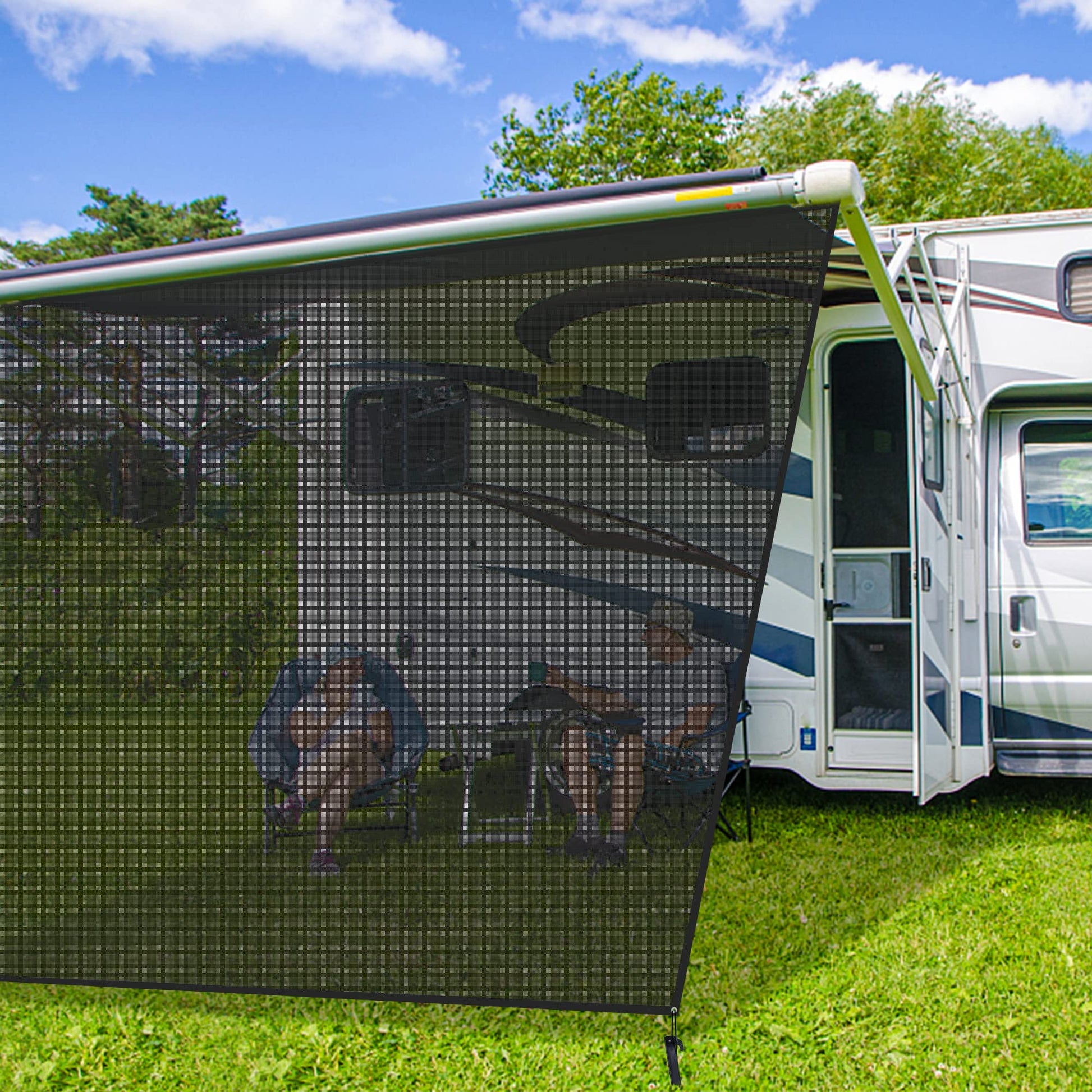 ["Sunshade: Used as a front RV awning and blocks about 90% of UV rays to protect our skin and eyes. It also provides a wide view.",