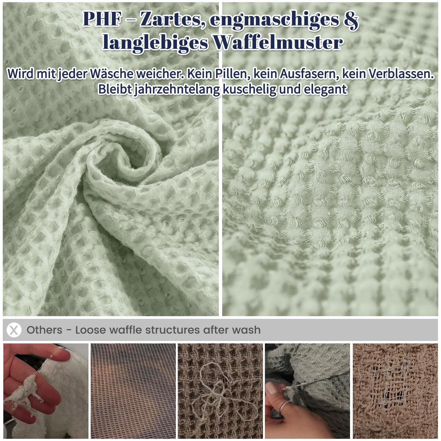 "All-season comfort - Perfect summer blanket: PHF cotton cuddly blanket can be used all year round and becomes an indispensable bedding in daily life. Soft, breathable, moisture-wicking, and pleasantly warm. Ideal for warm weather when looking for light coverage without overheating. Give your bed or sofa a fresh touch with our waffle weave blanket.",