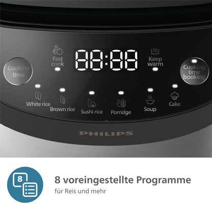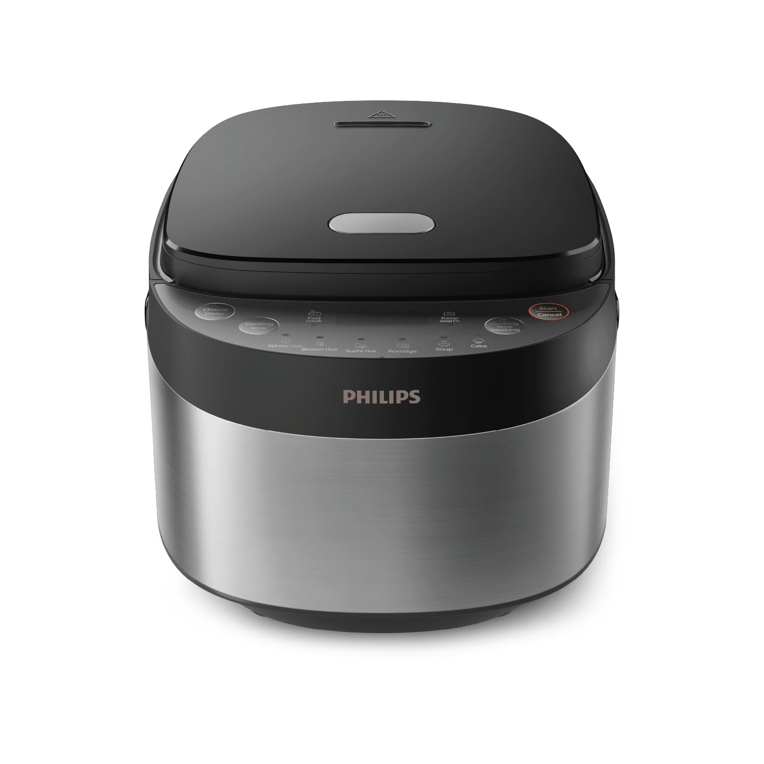 Philips Multi-Cooker 3000 Series - 0.85L, 8 cooking functions, 4-layer non-stick pot, 30-minute quick cook mode, Fuzzy Logic, Black-Silver design (HD3093/80)