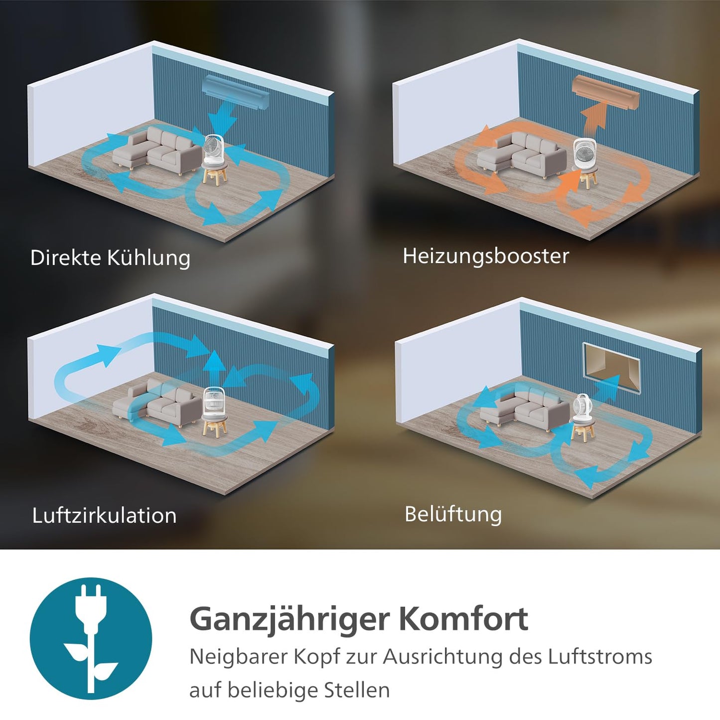 ["POWERFUL COOLING: Cools you quickly with a strong airflow that is noticeable from up to 25 m away, so you can feel your best.","ULTRA-QUIET: Experience 30% quieter operation* with our SilentWings technology, generating a noise level of only 23 dB(A).","DURABLE QUALITY: With over 80 years of experience in air care, Philips conducts over 110 rigorous tests on its fans before they hit the market to ensure exceptional quality and performance.","COMPACT, MODERN DESIGN: A minimalist, eye-catching design that seamlessly fits into any decor.","VERSATILE: Thanks to the 180° swiveling head, you can enjoy refreshing air exactly when you need it, whether for direct cooling or room air circulation.","CUSTOMIZED COMFORT: Enjoy powerful cooling or a gentle breeze with 3 speed settings, sleep mode, and a timer for added convenience."]