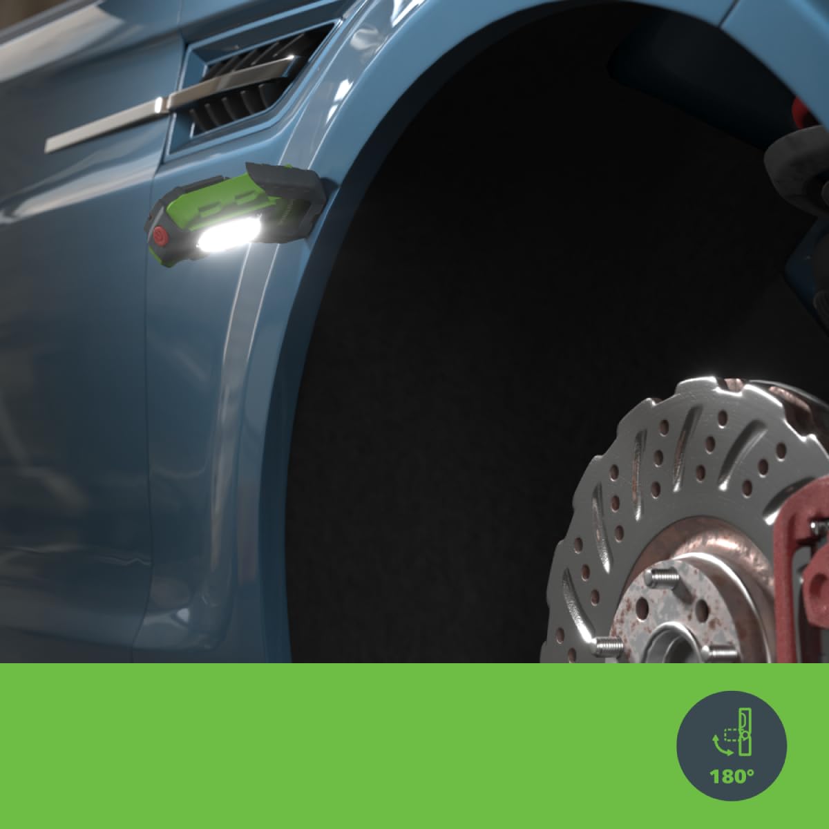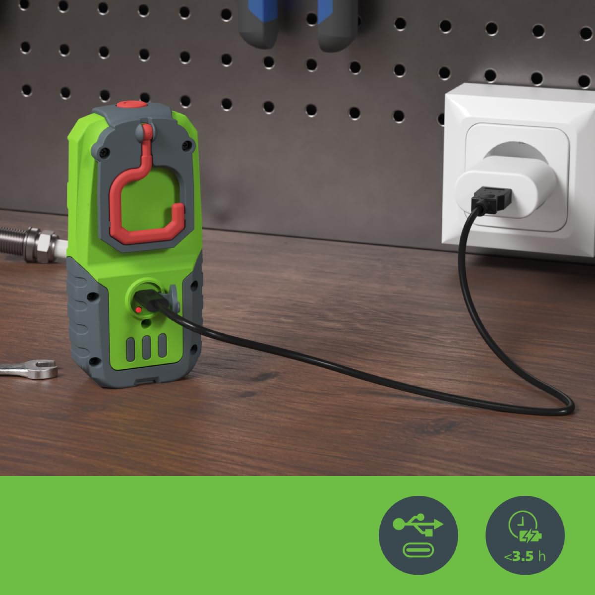 ["Small and handy LED work light for everyday use","Bright pleasant light (300 lumens Boost, 100 lumens Eco, 6000K)","Swiveling, rotatable hook and strong magnet","Rechargeable lithium battery (1800 mAh), battery life of 3-10 hours depending on light intensity, charging time approx. 3.5 hours","Robust and shockproof housing (IK08, IP20), USB-C charging cable included (no USB power adapter)"]