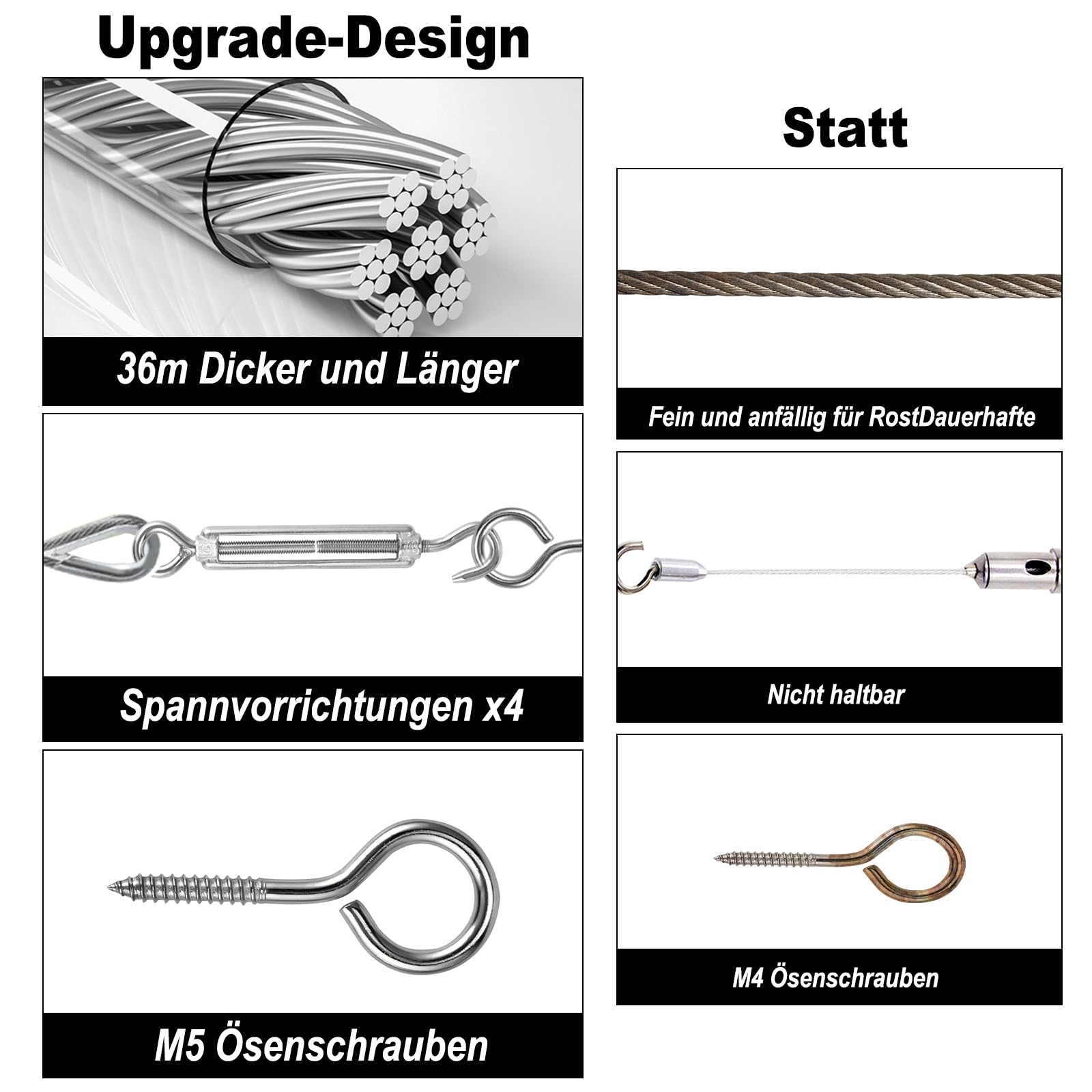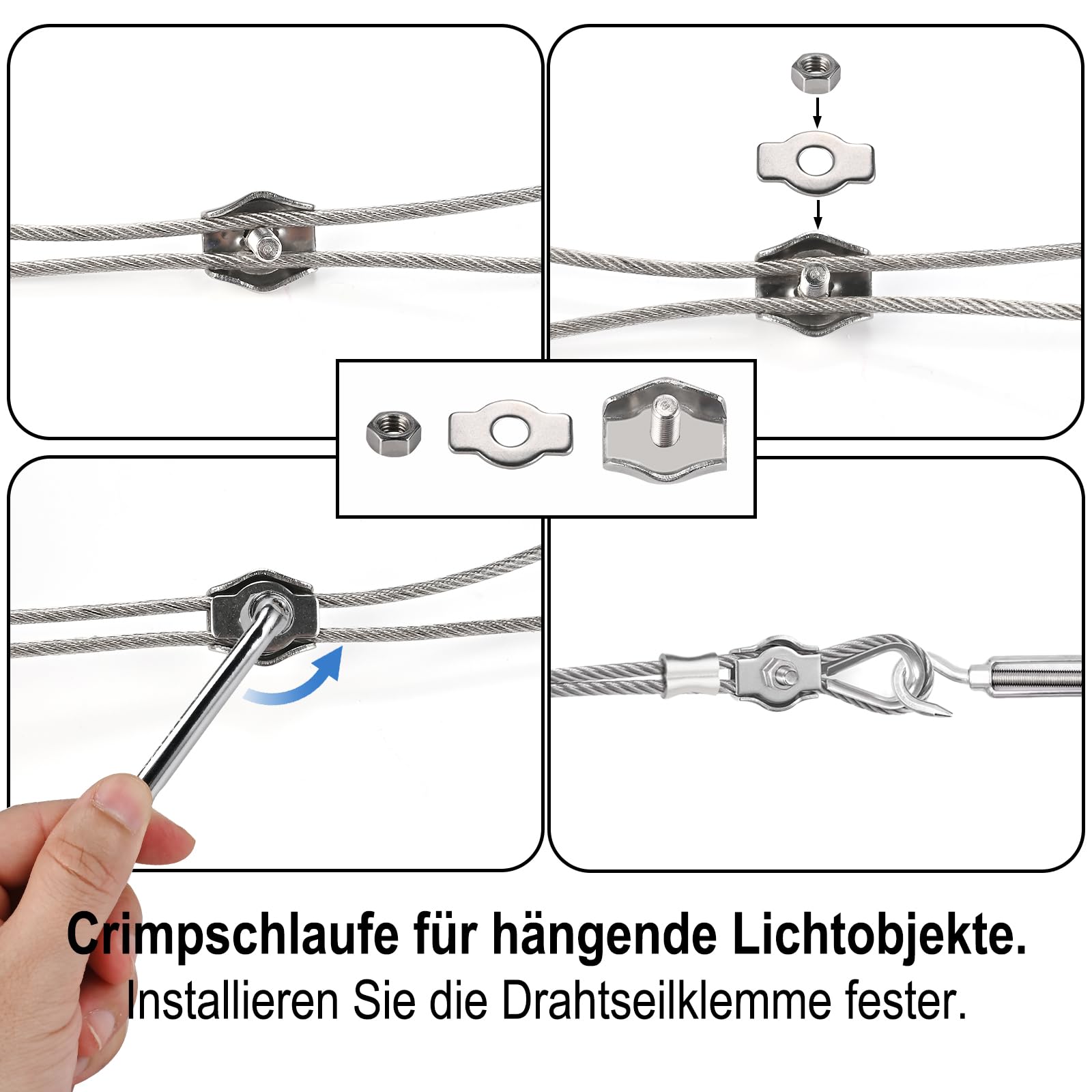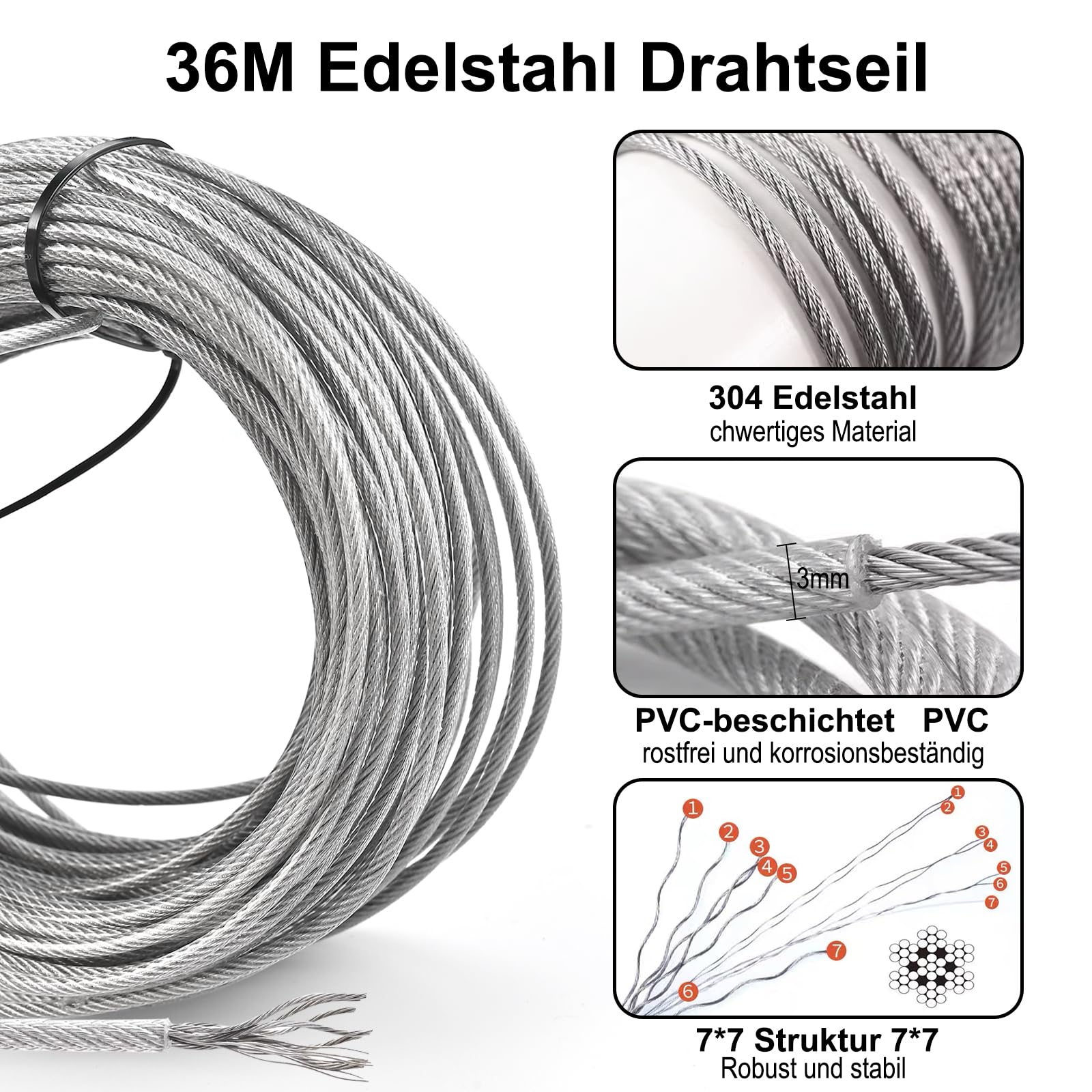 ["73 PCS Wire Rope Kit: 118.11 ft 3mm wire rope, 4 turnbuckles, 10 eye bolts, 8 wire rope clamps, 10 thimbles, 25 crimp loops, 10 plastic expansion tubes, 4 carabiner hooks, 1 wrench","Sturdy And Durable: The 3mm wire rope made of high quality 304 stainless steel has a stronger load capacity, with a 7x7 structure woven tightly with 49 strands of stainless steel wire, finer processing, strong and durable, providing stronger support for all heavy tasks. ps: Maximum load capacity 220lbs","Quality Design: Stainless steel wire rope with PVC coating to make the surface smoother and insulate the steel rope from contact with the outside, high weather, rust, and corrosion resistance. The crimp loops and wire rope clamps can help the stainless steel wire rope to be more secure, allowing the wire rope to be used safely and long-term","Easy To Install: You can cut the wire rope with loops to any length freely, use the wire rope tensioner, and adjust the wire rope to the tightness you want. We provide step-by-step instructions with pictures, even beginners can easily install and remove. German instructions included","Multipurpose Wire Rope Kit: The wire rope set is suitable for steel wire curtain hanging, deck railing kit, trellis for climbing plants, hanging patio lights in the garden, outdoor lights, outdoor applications of tent ropes, sun shade fastening, fences, clotheslines, etc."]