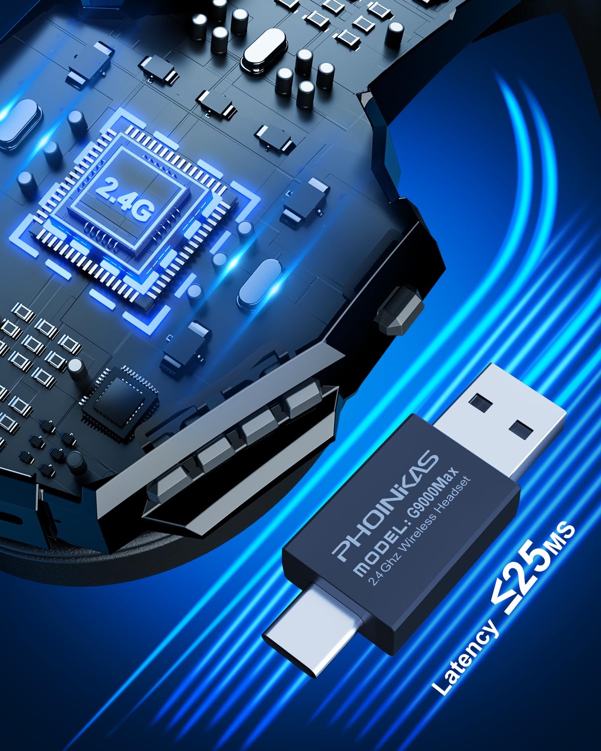["Stable Connection & 2-in-1 Multi-Platform Compatibility: The wireless PC headset combines powerful 2.4 GHz lossless wireless technology, supporting both the 2.4 GHz USB receiver and the 3.5 mm wired connection modes. It is compatible with PS5, PS4, PC, Mac, mobile, tablet, and Switch (note that the microphone on Switch is invalid). For Xbox Series, only the 3.5mm cable mode is supported.",
