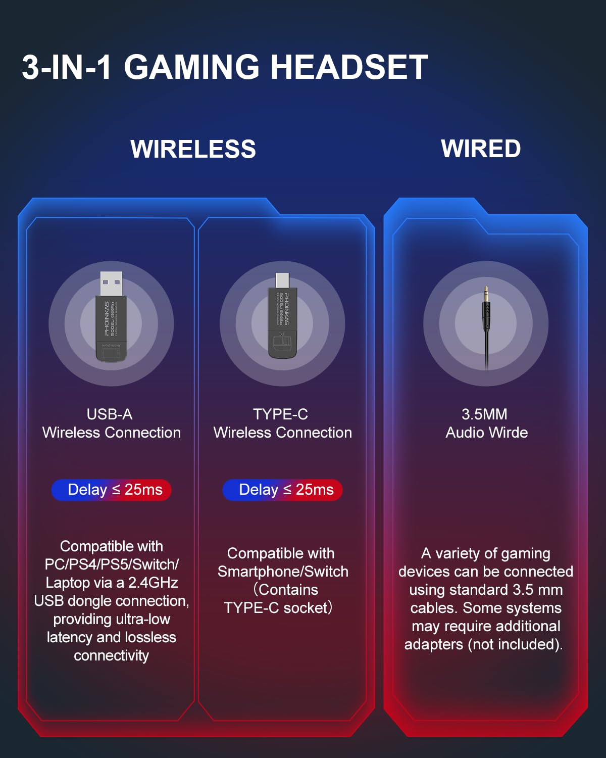["Stable Connection & 2-in-1 Multi-platform Compatibility: The wireless PC headset combines powerful 2.4GHz lossless wireless technology that supports both the 2.4GHz USB receiver and the 3.5mm wired connection modes. It is compatible with PS5, PS4, PC, Mac, mobile, tablet, and Switch (please note that the microphone is invalid on Switch). For the Xbox series, only the 3.5mm cable mode is supported.",