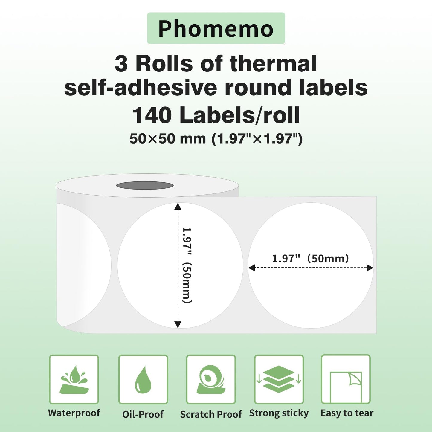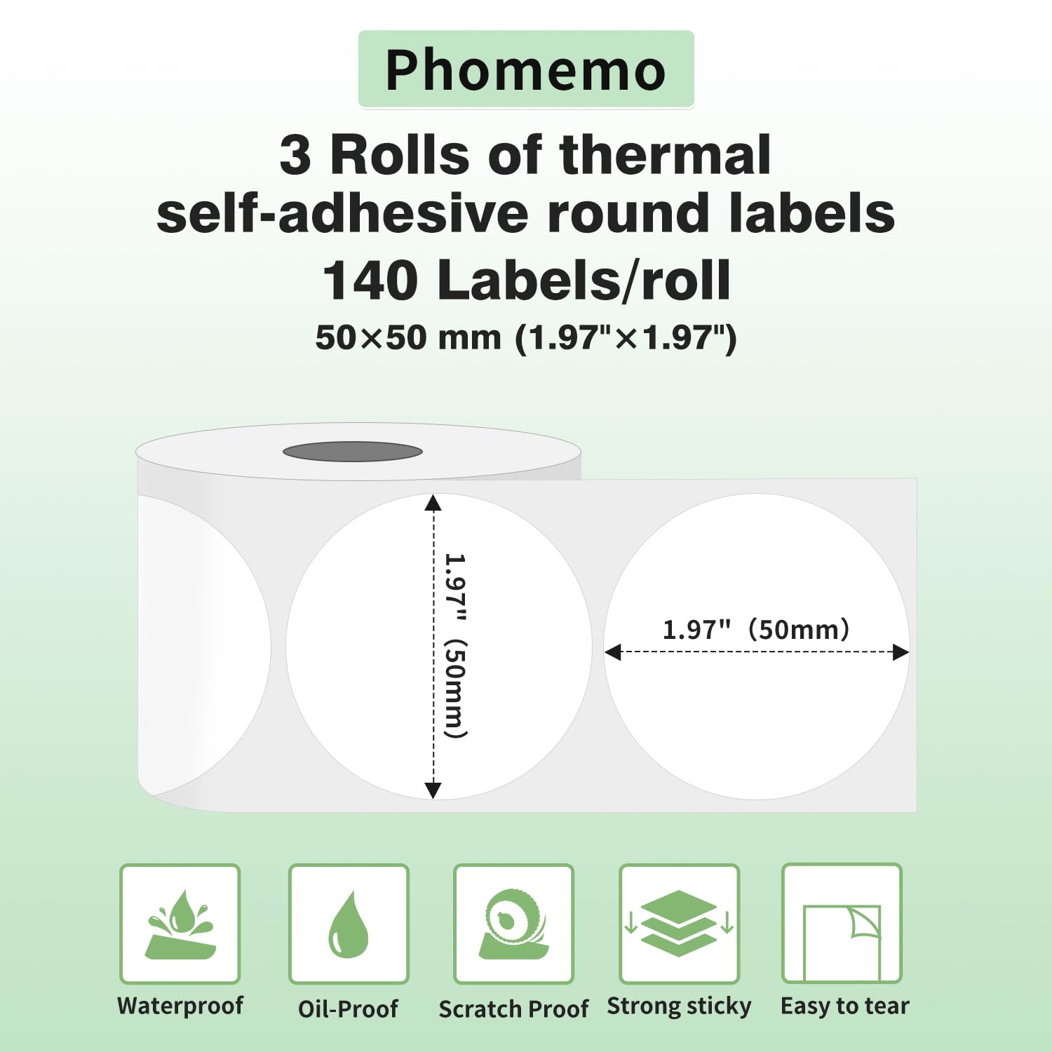 ["Phomemo 3 Rolls Multifunctional Round Label, product size -50 x 50 mm (1.96" x 1.96"); Number of labels: 140. 3 Rolls, Compatible with Phomemo M110 M200 M120 M220 M221 Label Printer.", "Round labels are great for printing Popsocket stickers, small product labels, gift tags, can labels, and logo labels.", "Easily create personalized labels. Phomemo offers a selection of thousands of free designs or templates. You can edit and create your own personalized label designs.", "High-quality, high-resolution printing - Phomemo label thermal paper. Direct thermal printing technology delivers clear letters without the need for expensive ink or toner.", "Phomemo Self-Adhesive Multifunctional Labels are waterproof, oil-resistant, wear-resistant, and highly viscous. Can be securely attached to envelopes, paper, plastic, glass, and metal."]
