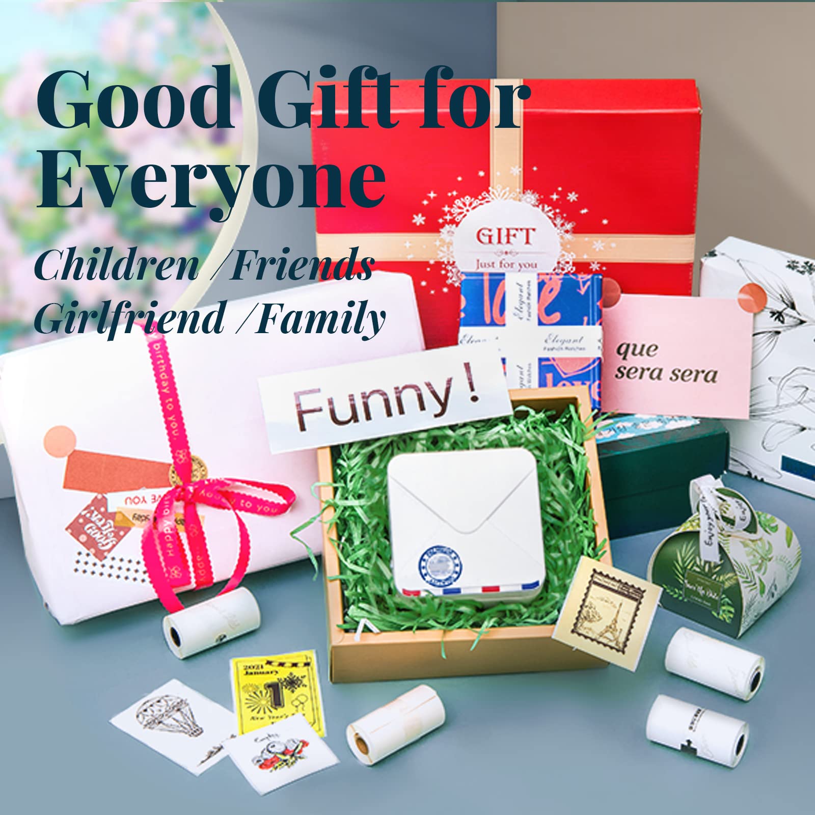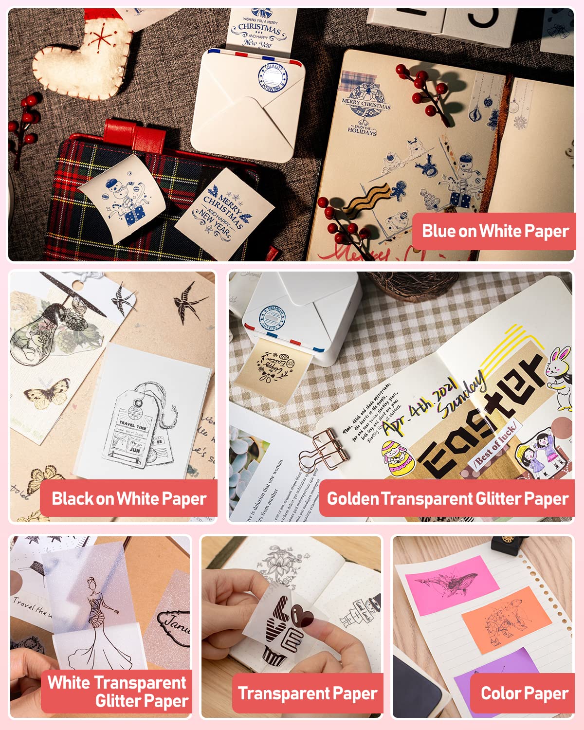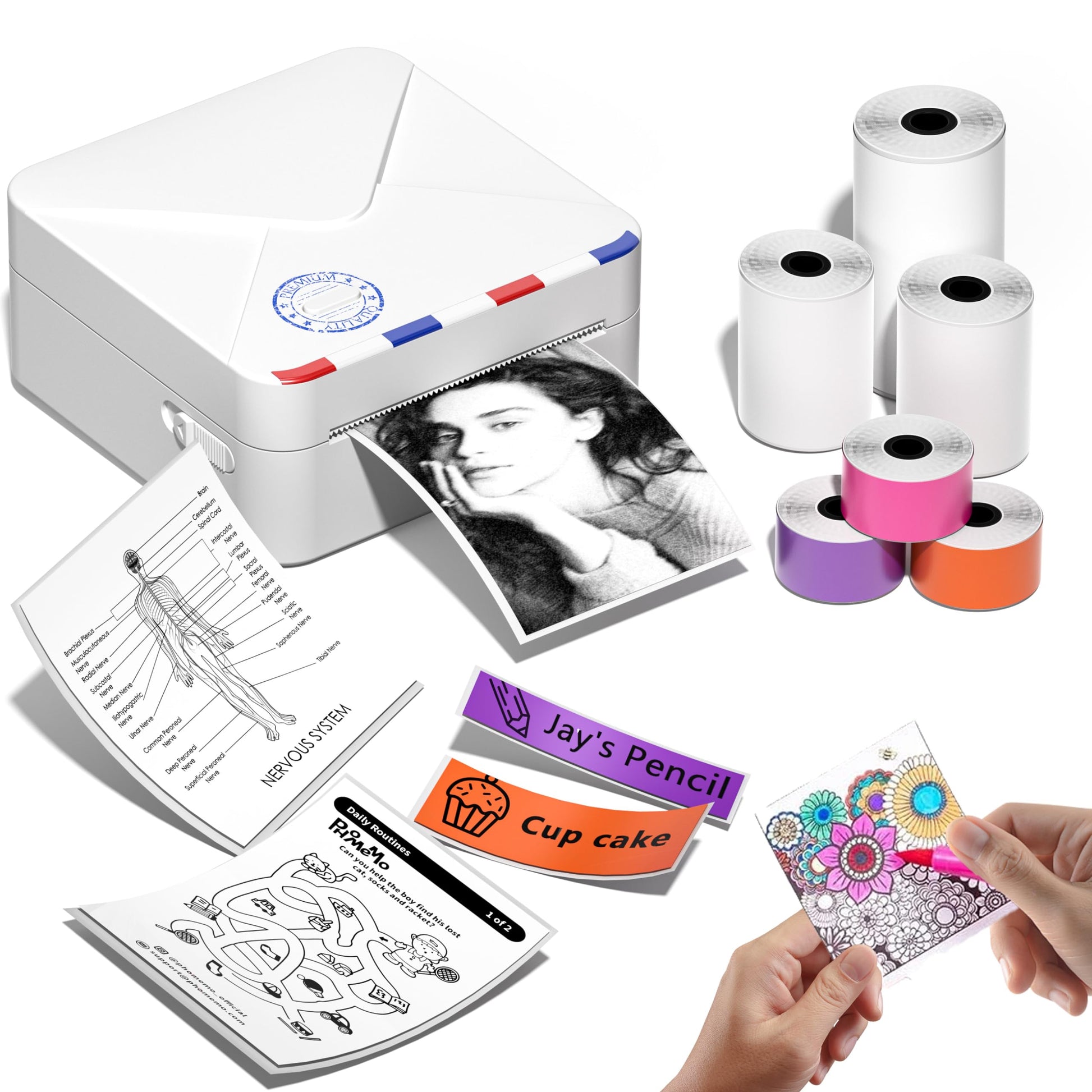 ["Package includes: 1 x M02S Mini Printer, 1 x 53mm white paper roll, 2 x 25mm paper rolls (clear, translucent), 3 x 15mm paper rolls (purple, pink, orange), 1 x user manual, 1 x USB cable","Three printing formats: The Phomemo M02S pocket printer is compatible with three label sizes: 15mm, 25mm, and 53mm. It can be used as a household label printer","300 dpi mini printer: The 300 dpi photo printer provides a completely new experience when printing text and images. You can print black and white vintage stickers anytime and use them for notes or crafting","Bluetooth thermal printer: Connect your mobile phone/tablet to the wireless printer M02S. For Android 7.0 or iOS 13.0 or higher","The Phomemo App has a lot of features. For example, you can print patterns, QR codes, forms, and images. It offers many interesting presets, and you can freely edit the content of the stickers","Mini printer for smartphones: Simple and elegant design, the mini size fits in your pocket. It is great for bullet journaling, study notes, printing photos, labels, and also makes a wonderful gift"]