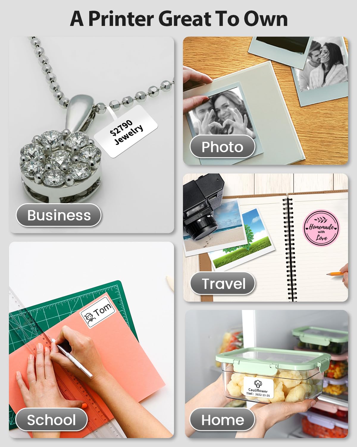 "Thermo Bluetooth label printer - No more ink, toner, and ribbon. This thermal label printer prints using thermal technology, supports batch printing of Excel forms with one click. It is suitable for multiple industries: small businesses, grocery stores, retail, shops, schools, apartments, etc."