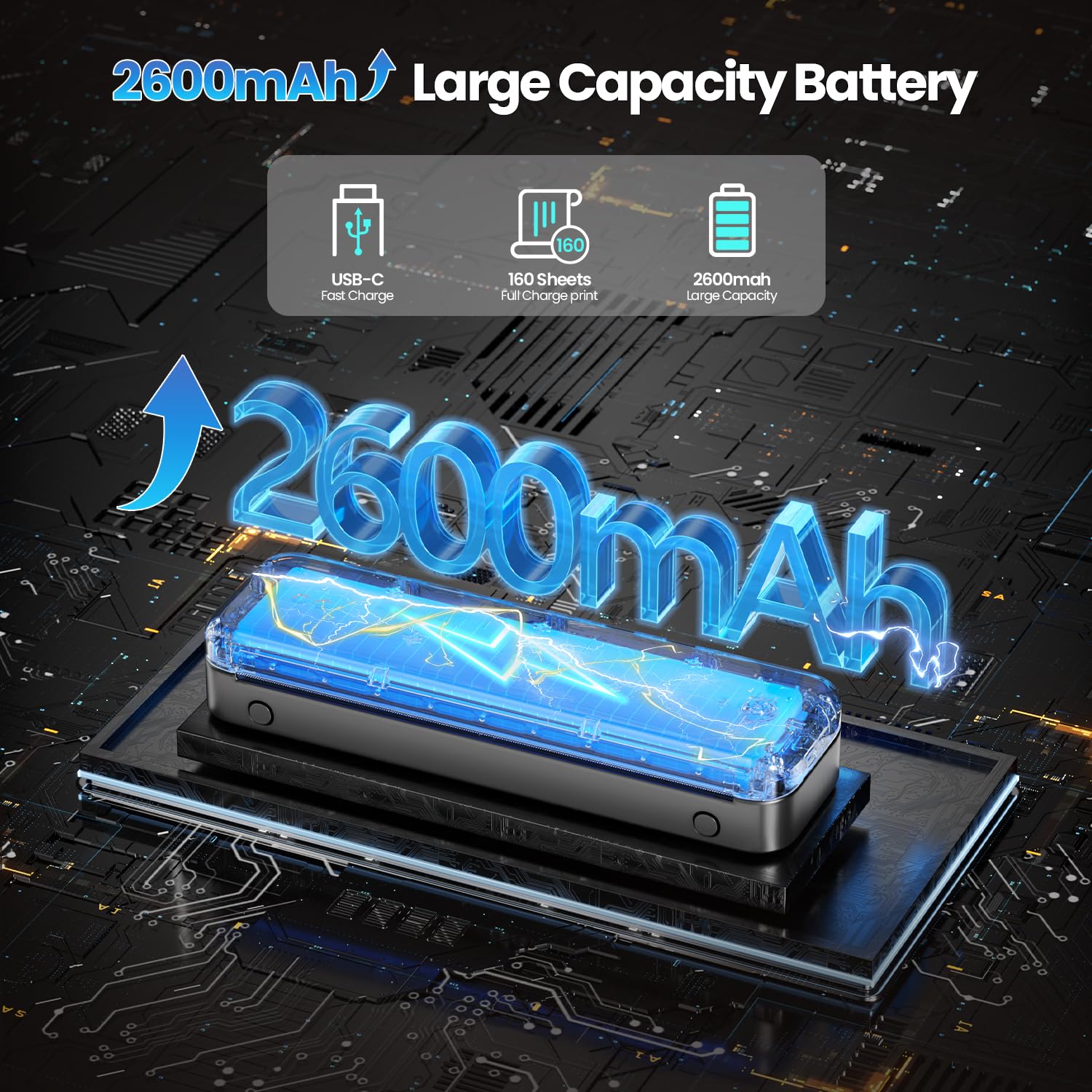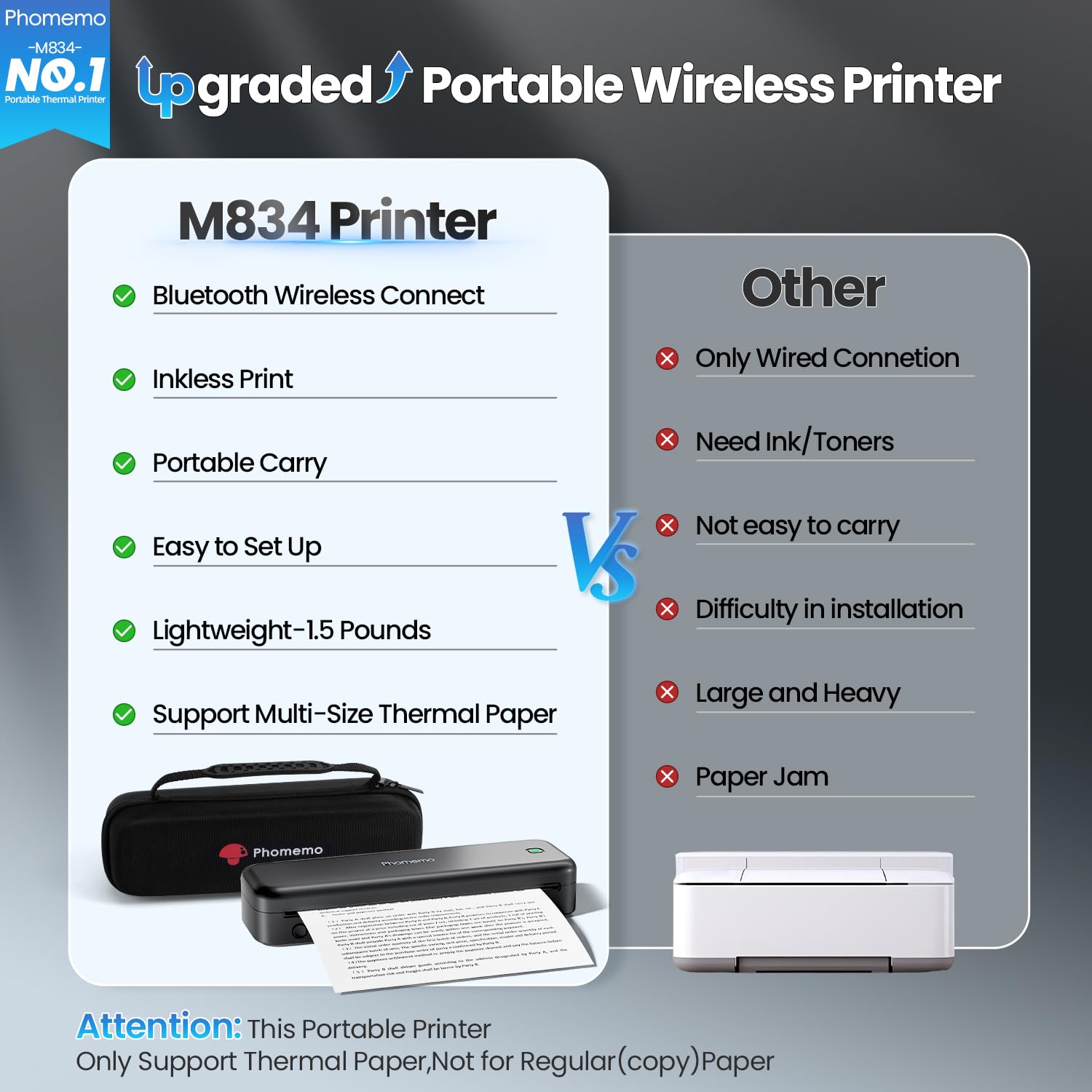 ["Phomemo M834 Thermal Printer A4 Kit: 1 M834 portable printer, weighing only 700 grams, 1 carrying case, 4 rolls of thermal paper (53, 80, 110, 210 mm wide). M834 Mobile Printer A4 can print receipts, contracts, photos, images, diaries, DIY, greeting cards, study notes, small notes, to-do lists, and many other sizes and contents. Warm tips: supports only black and white printing", "【High-Resolution Thermal Printer】The Phomemo M834 thermal printer A4 with integrated slot for removable cards prints on 216 mm/210 mm/110 mm/80 mm/53 mm (US Letter/A4/4.33\"/3.14\"/2.08\") thermal paper and also supports roll and folded paper. With a resolution of 300 dpi, the printer prints on high-quality thermal paper for optimal instant printing, and thanks to the smooth, clear paper, you never have to worry about blurry prints", "【Easy to Use】The Phomemo M834 mobile printer a4 for on-the-go is compatible with Android and iOS mobile phones (via Bluetooth), Windows 7-11 and MacOS laptops (via USB cable). Simply download the free Phomemo APP, connect wirelessly via Bluetooth, and print easily. Hundreds of free templates and patterns are included in the app and can be printed directly, increasing work efficiency. This makes it perfect for offices, schools, business trips, and personal use", "【Lightweight and Portable】Phomemo M834 portable printer - travel printer a4 weighs 700g and measures only 264*78*45mm, so you can carry it in your laptop bag or backpack. Phomemo M834 portable thermal printer has a built-in 2600mAh battery for longer battery life, making it an ideal choice for your business trips, school outings, or other travels", "【Ink-Free Printer】The Phomemo M834 mini mobile portable printer a4 uses inkless thermal printing technology, so you don't have to buy expensive ink cartridges or worry about ink drying out or getting clogged. In just a few simple steps, you get a high-quality, cost-effective printing experience that is both convenient and environmentally friendly"]