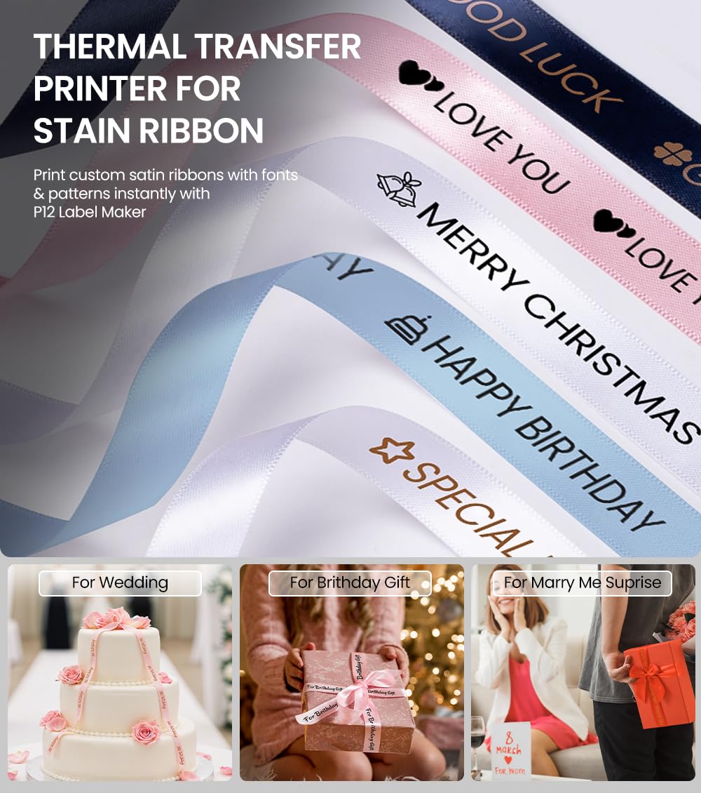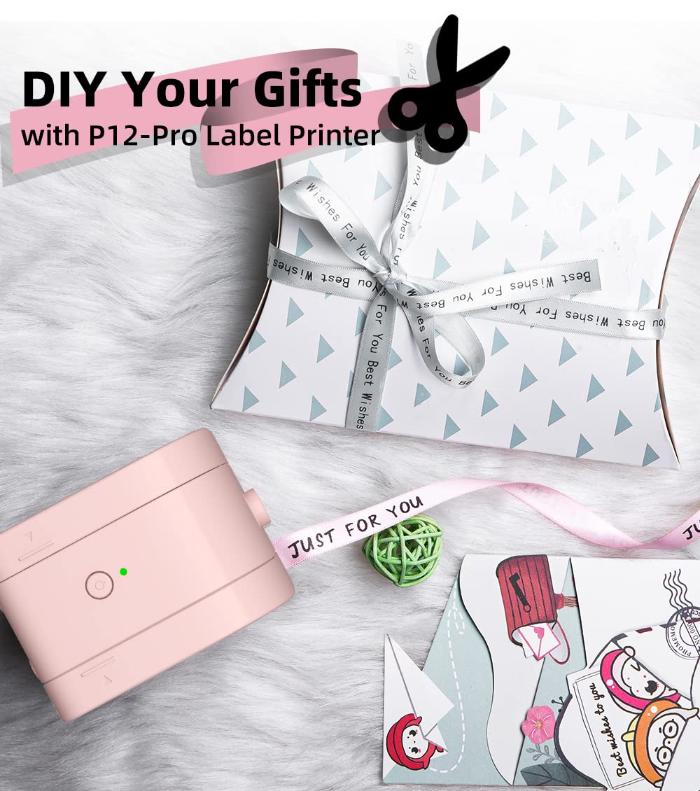 Hundreds of P12 label tapes: This bluetooth label maker prints on P12 label tape, available in a wide range of colors and materials. It not only includes self-adhesive label paper and plastic labels in different colors, but also satin ribbons for Christmas decoration and fabric iron-on labels for clothing (including the popular transparent and black labels).