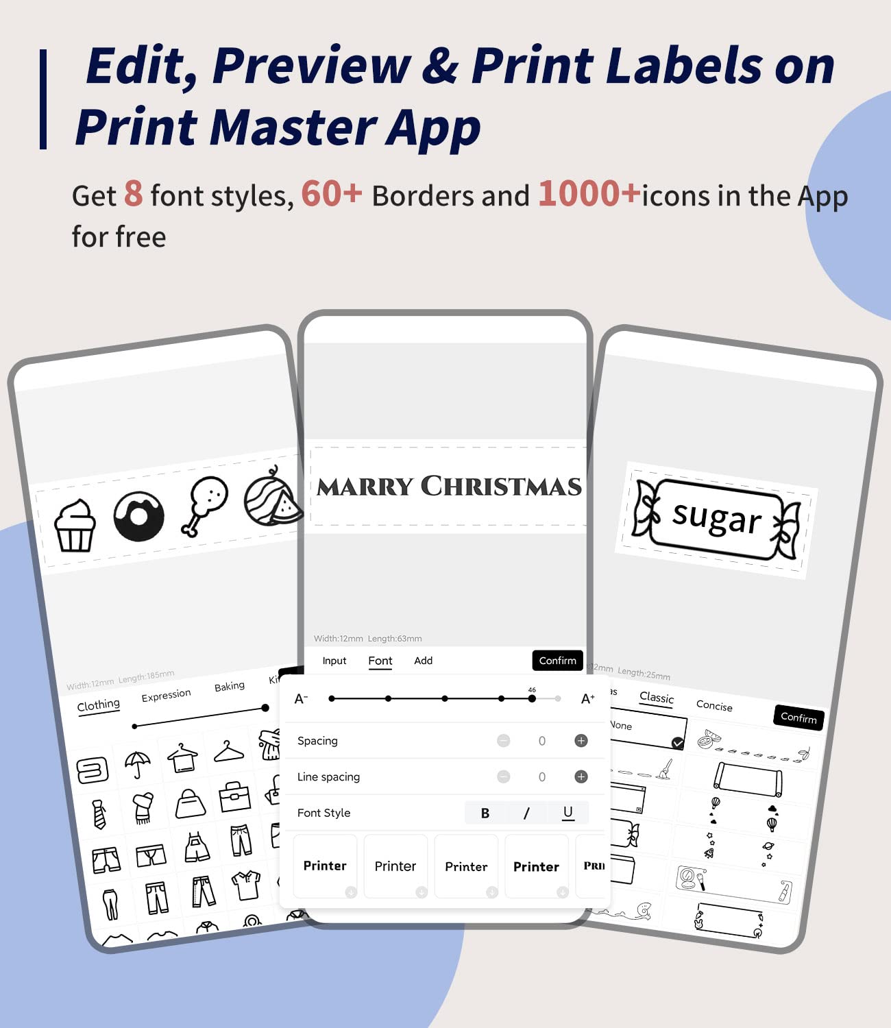 Bluetooth connectivity: Bluetooth connection via the Print Master app to design and print labels anytime, anywhere. The app offers 12 fonts, 62 frames, and 1096 symbol stickers to make label printing easy and efficient. The bluetooth label maker supports 1-3 lines of text.