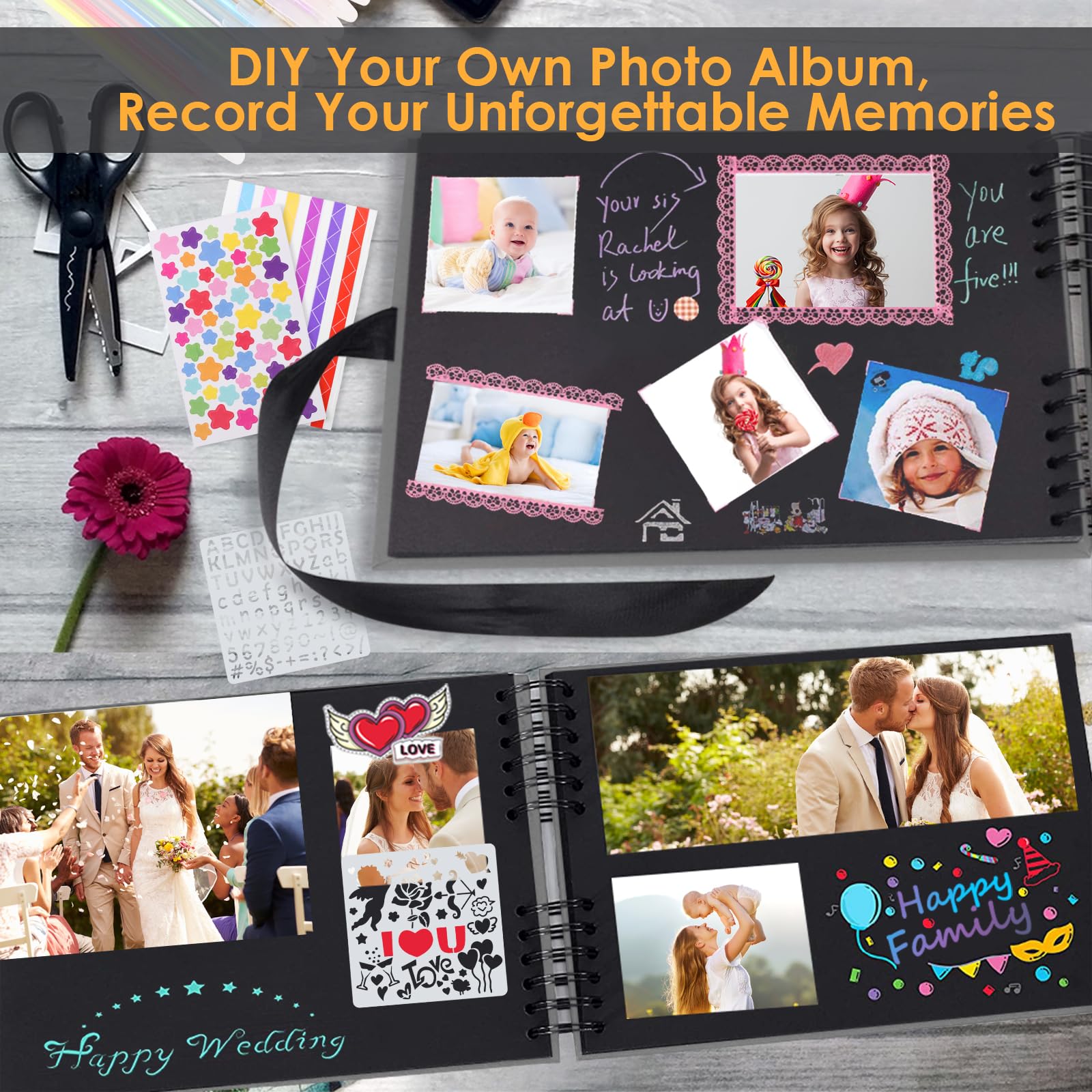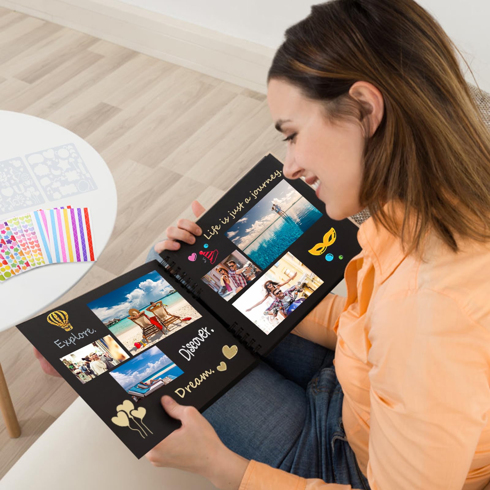 ["Customize Your Memories with Perfect Size"] - Large size 11.81" x 8.3" with 40 sheets/80 pages of thick black loose-leaf craft paper. The photo album can hold over 160 photos. Additionally, there is a photo opening on the cover to highlight your scrapbook. Perfect for photos, artwork, travel reports, adventure book, and guest book signatures.