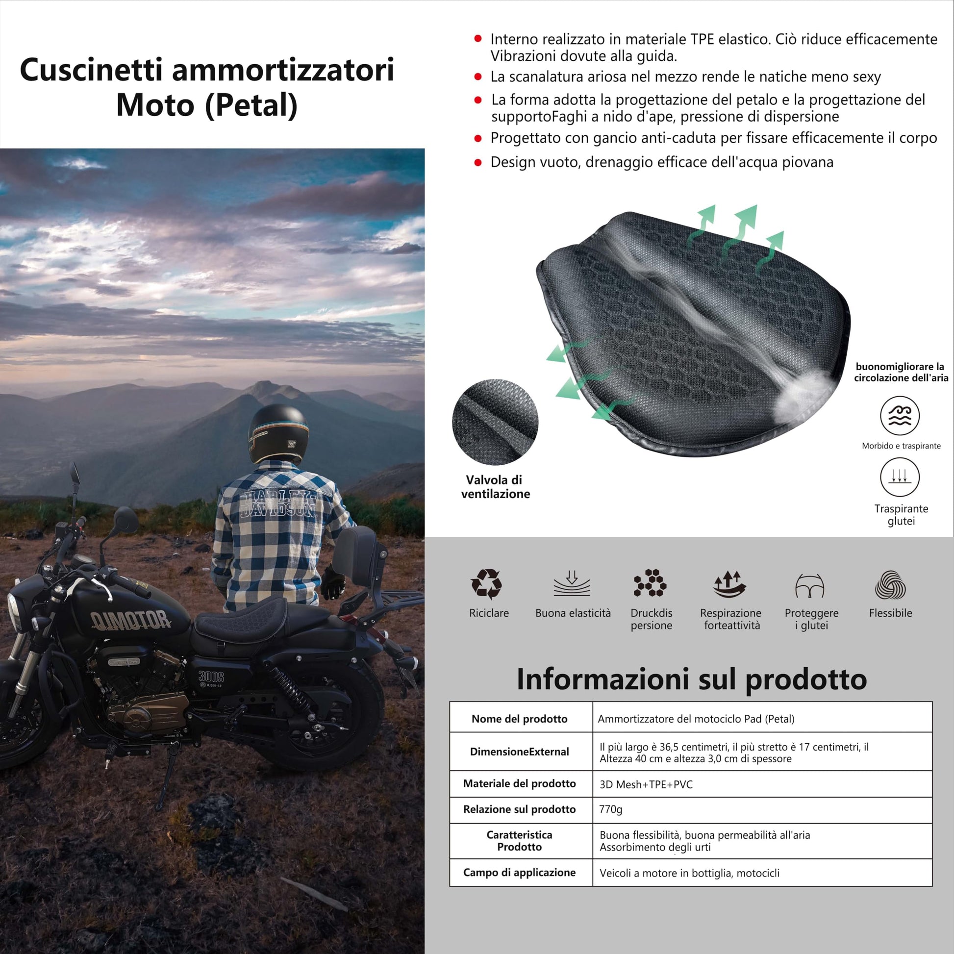 "[New Design] PhyiFlbey motorcycle seat cover is designed with 3D honeycomb shape, so that air can circulate faster than sponge cushions, it can effectively help cool down and distribute heat, so you can stay away from sweat and heat. Note: The size of the motorcycle seat cushion is 38cm, 32cm, 7cm and the thickness is 3.5cm. Please check if the size is suitable."
