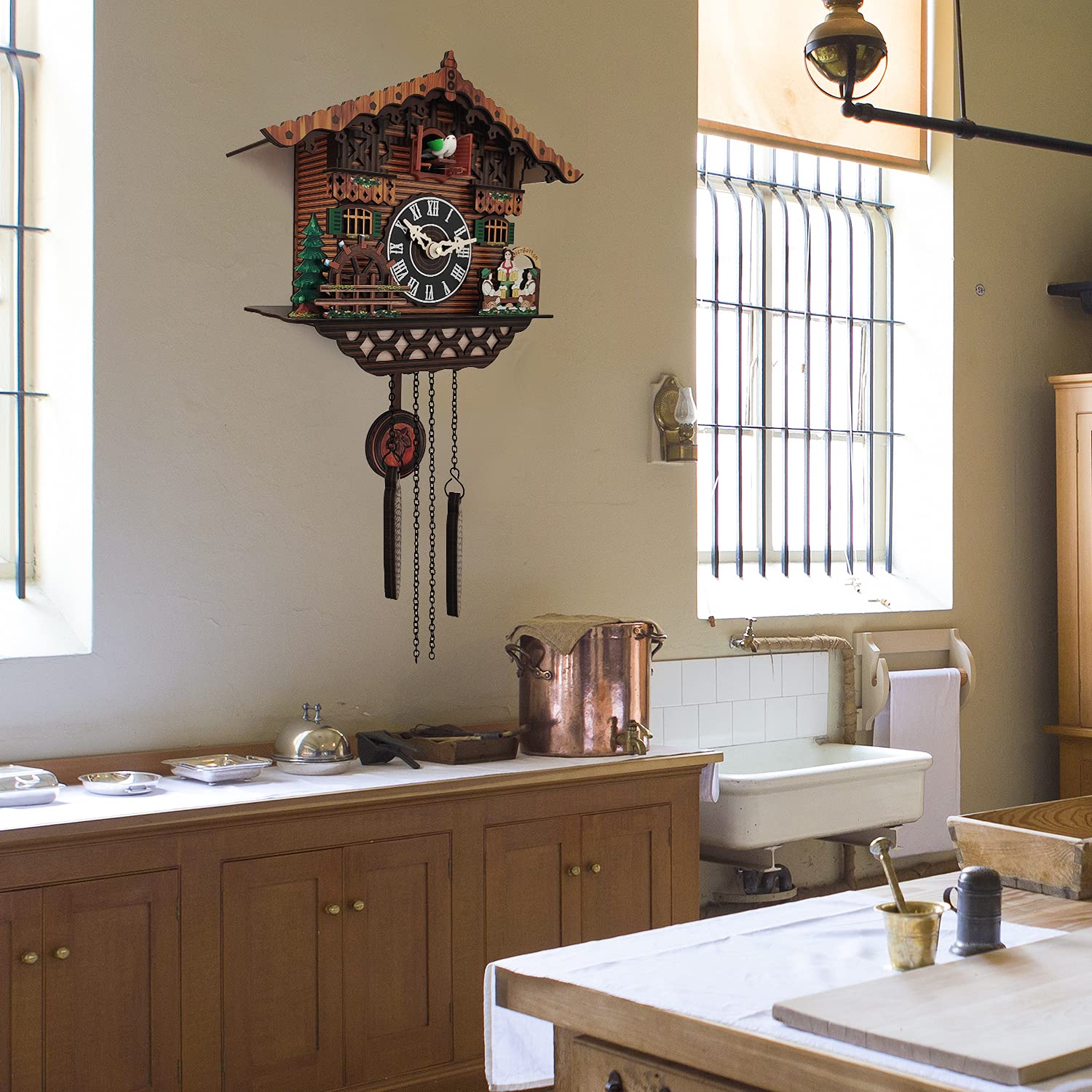 ["Retro design: The cuckoo clock has the shape of a wooden house and features realistic Christmas trees, figures, water wheels, beer, and life scenes. We use the most primitive wooden house and life scene style to design cuckoo clocks, and they can be decorated anywhere in the house.","High-quality wood: The cuckoo clock is made of 3mm thick medium-density fiberboard, which is not easily deformed and more stable than tree trunks. Vivid UV printing surface, the color never fades. Exquisite workmanship, realistic model, can be hung in any corner of the house.","Timely announcement: At the full hour, the cuckoo jumps out of the window and makes a pleasant "Cuckoo" sound. The cuckoo's melody can be set with a switch; it can be set to rest at night, so the cuckoo stays in the wooden house and does not disturb the owner while resting.","Forget the annoying ticking: The quiet outdoor wall clock with a premium movement to ensure that it doesn't disturb people in the vicinity and you never hear ticking sounds like another exquisite clock. This clock is also a good choice for your interior decoration.","Battery operated: Powered by 3 x LR14 batteries (not included), so you don't have to worry about power, cables, or expensive construction costs. This outdoor wall clock is easy to install and can be attached to any wall, fence post, or in your home."]