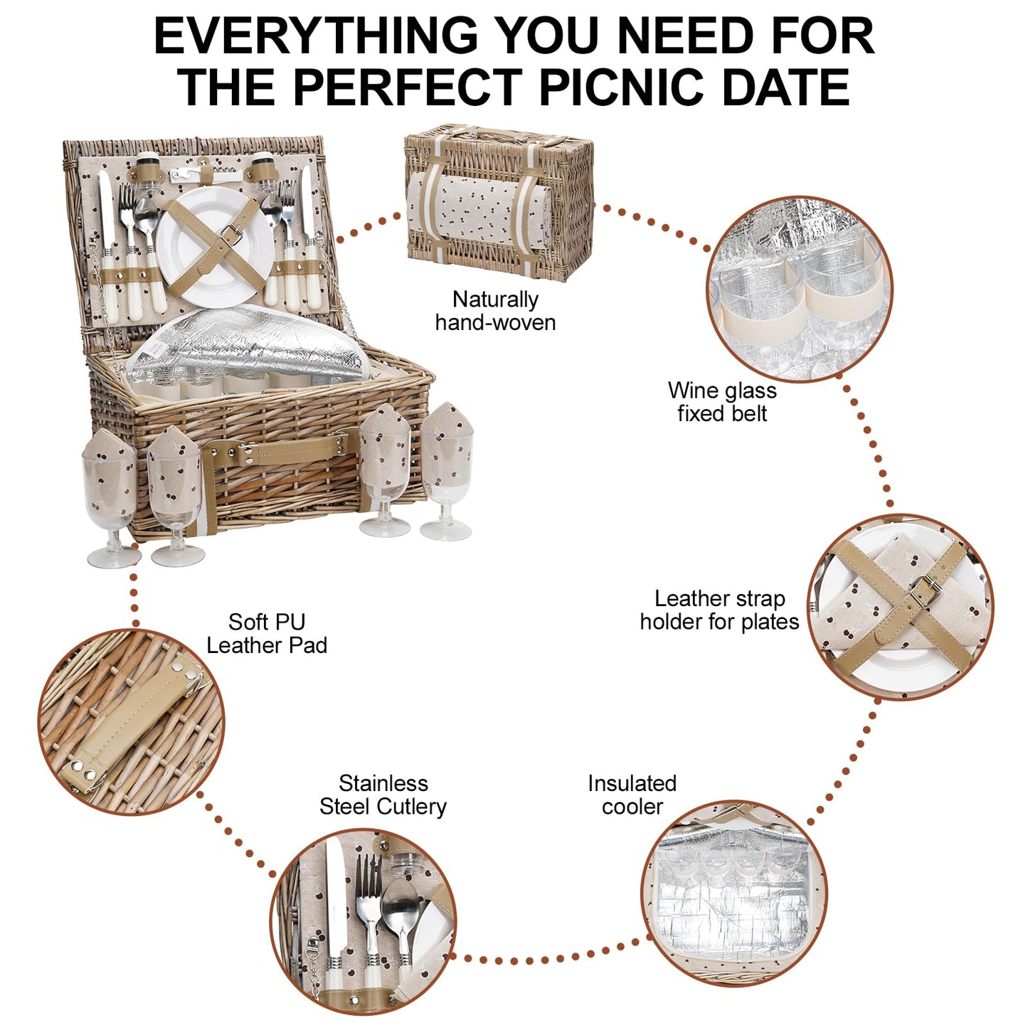 Waterproof picnic blanket: The willow picnic basket set comes with a large picnic blanket, size: 145 x 145cm, perfect for 2 or 4 people. You can use it with a picnic basket or separately.
