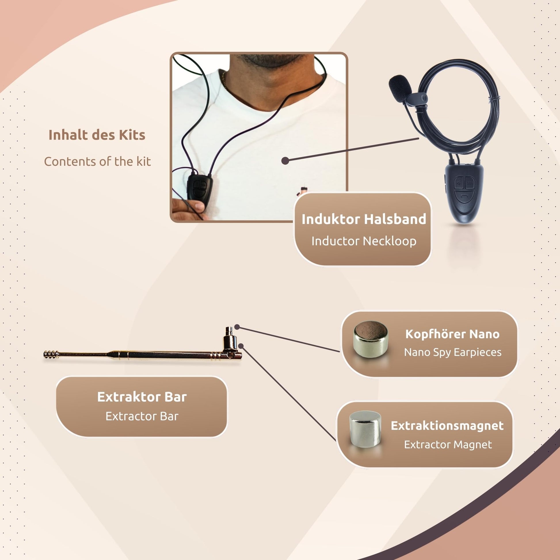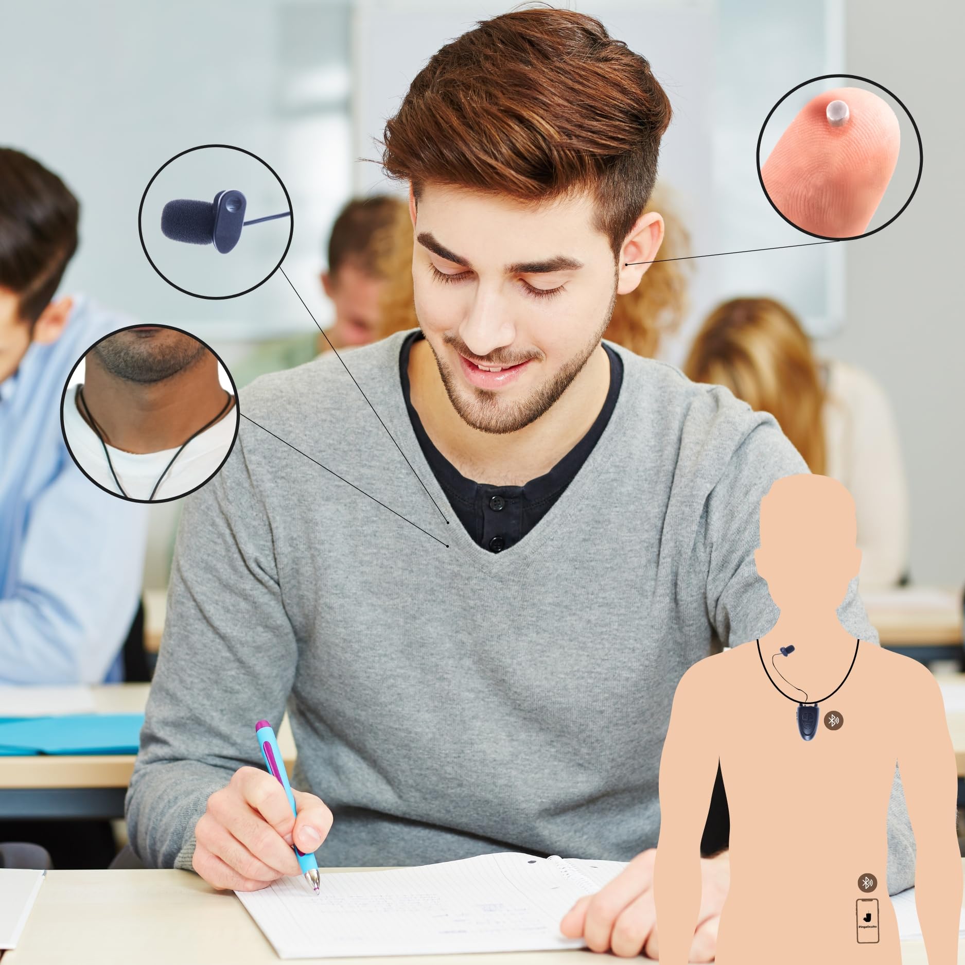 ["📶【 Bluetooth Earbuds 】The smallest wireless, hidden magnetic earbuds on the market with a mini size of only 3 mm in diameter. Completely hidden in the ear and undetectable.","⭐【 For Exams 】The spy earphone serves as a cheat sheet for exams, presentations, or espionage communication. The magnetic spy earbud can be used in silent environments such as an exam.","📱【 Calls and Recordings 】Works with mobile phone for calls or recordings by connecting via Bluetooth 4.0. Compatible with all mobile phones.","🎙️【 Wired Microphone 】It includes a high-quality wired microphone in the induction necklace that can be hidden in the sleeve or necklace and communicates with whispers. It also includes buttons for controlling multiple functions.","🔋【 Large Autonomy 】Battery life of the induction necklace is approximately 4 hours. Includes charging cable and US charger for the induction necklace. The earpiece does not need to be charged."]