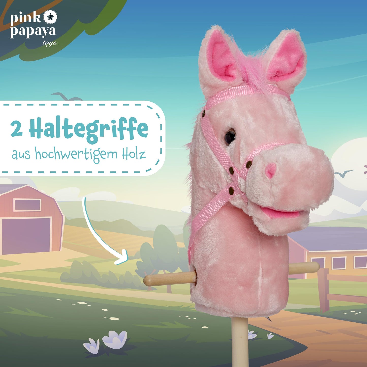 ["DESIGN! Beautiful design and high-quality craftsmanship make this cute hobby horse a children's dream come true! The toy horse is a great gift idea!","KUSCHELWEICH! With handles and reins on the soft plush head, on a 65 cm wooden stick with practical wooden wheels. The perfect companion for little adventurers.","AUSSTATTUNG! Pressing the ear of the cuddly horse produces 2 sounds, a gallop and a neigh.","ZUCKERSÜß! With its loyal button eyes and magical sounds in the ear, the hobby horse will carry your child over hill and dale.","MARKENPRODUKT! Each Pink Papaya toy horse is handcrafted and unique. Toy horses for boys and girls, available in many exclusive designs."]
