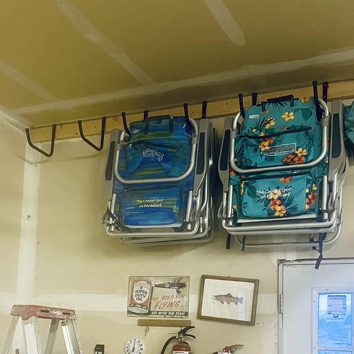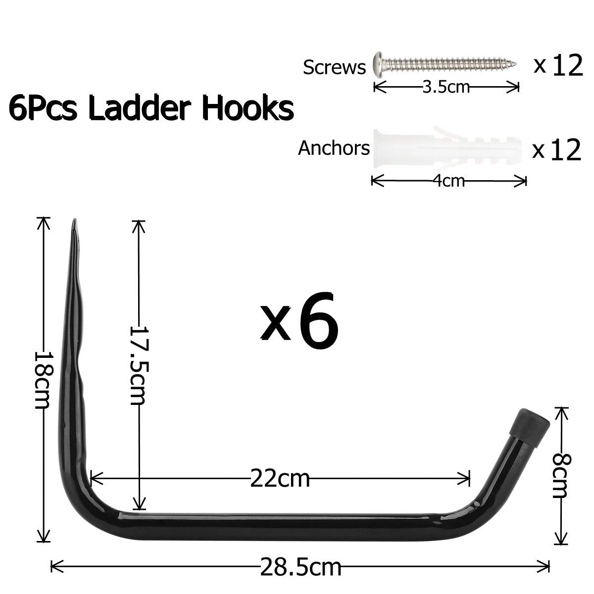 ["Multifunctional: Garage storage hooks are ideal for organizing especially folding chairs, ladders, bikes, tools, garden hoses, wood, sports equipment, and other bulky items.","Durable: Wall-mounted ladder hanger is a set of 6 pieces 28.5 cm hooks, each hook can hold up to 55 lbs, and you can use two ladder hangers as a match to hang heavy items.","High-Quality Material: These garage hangers are made of 16 mm thick steel tube, which is durable and stable. Powder-coated design makes it eye-catching and rust-resistant.","Size and Package: Our J-hooks are a set of 6 wall brackets, the size of these large ladder hooks is 7.5 inches x 11.2 inches (H x W), and the tube diameter is 0.63 inches, with 12 screws and 12 plastic anchors.","Easy to Install: Make a small pencil mark where the center of the go will be and drill a hole in the spot you marked. Make sure the hole you drill is deeper than the length of the anchor. Then insert the drywall anchors into the hole. Finally, screw the bolt in with a screwdriver."]