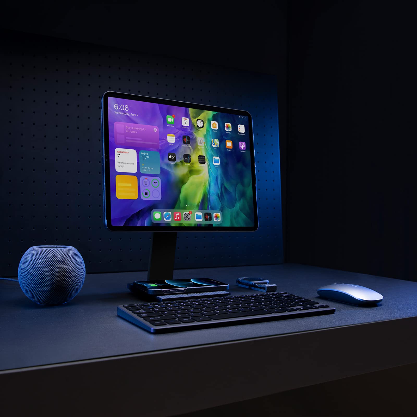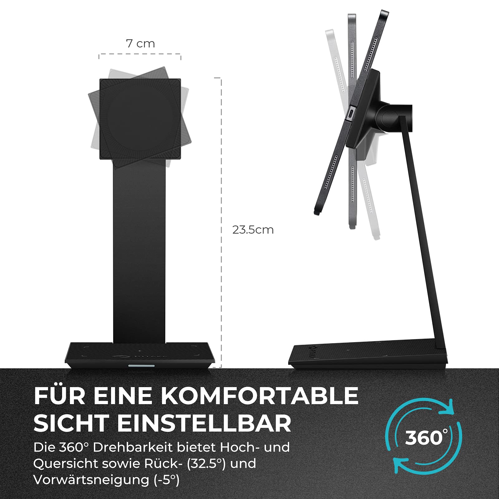"Multifunctional stand: Base charging station of the stand supports up to 15W wireless charging for Qi certified smartphones and iPhone 7.5W. The top part serves as a holder for the iPad, universally 2-in-1 desktop tablet stand.",