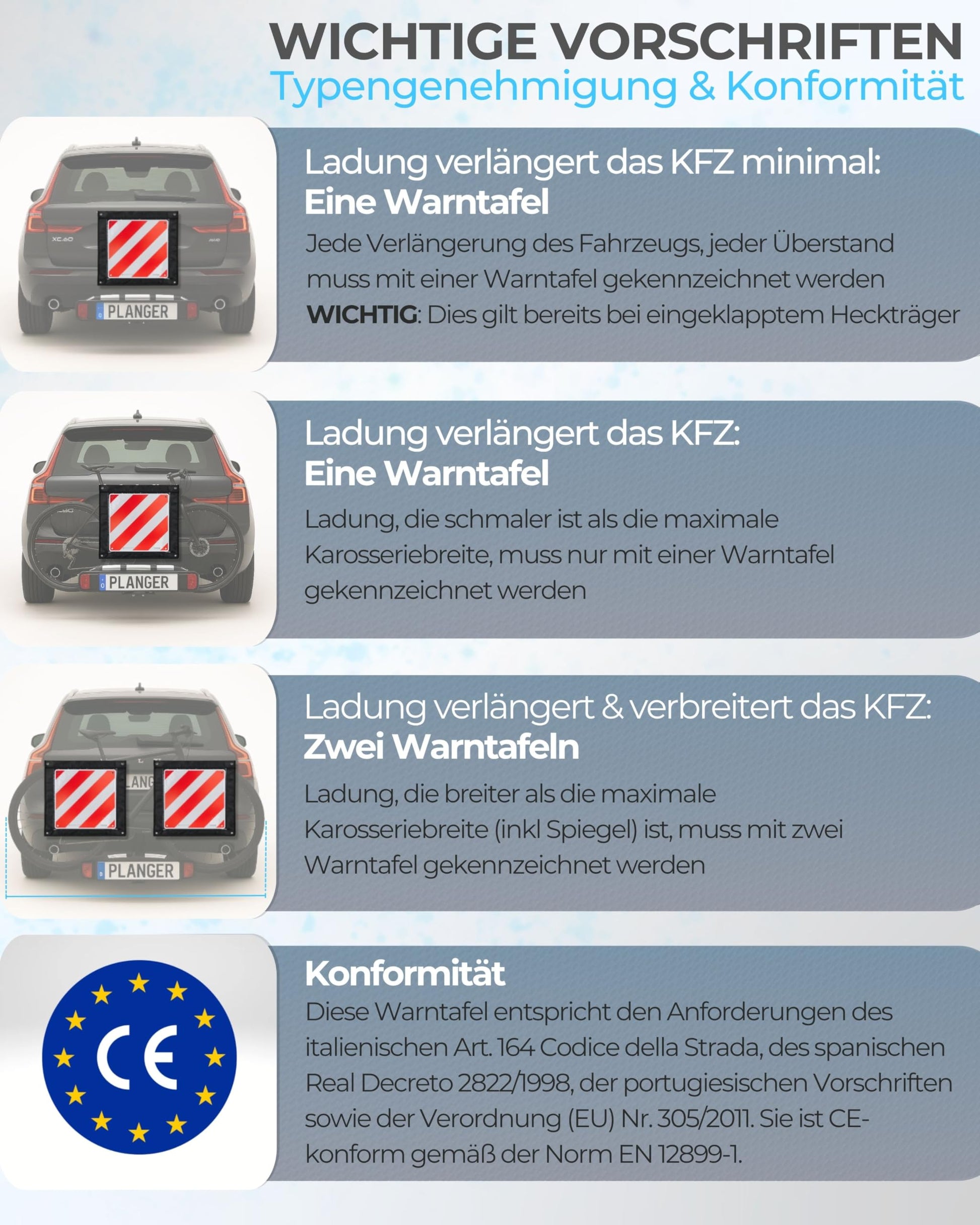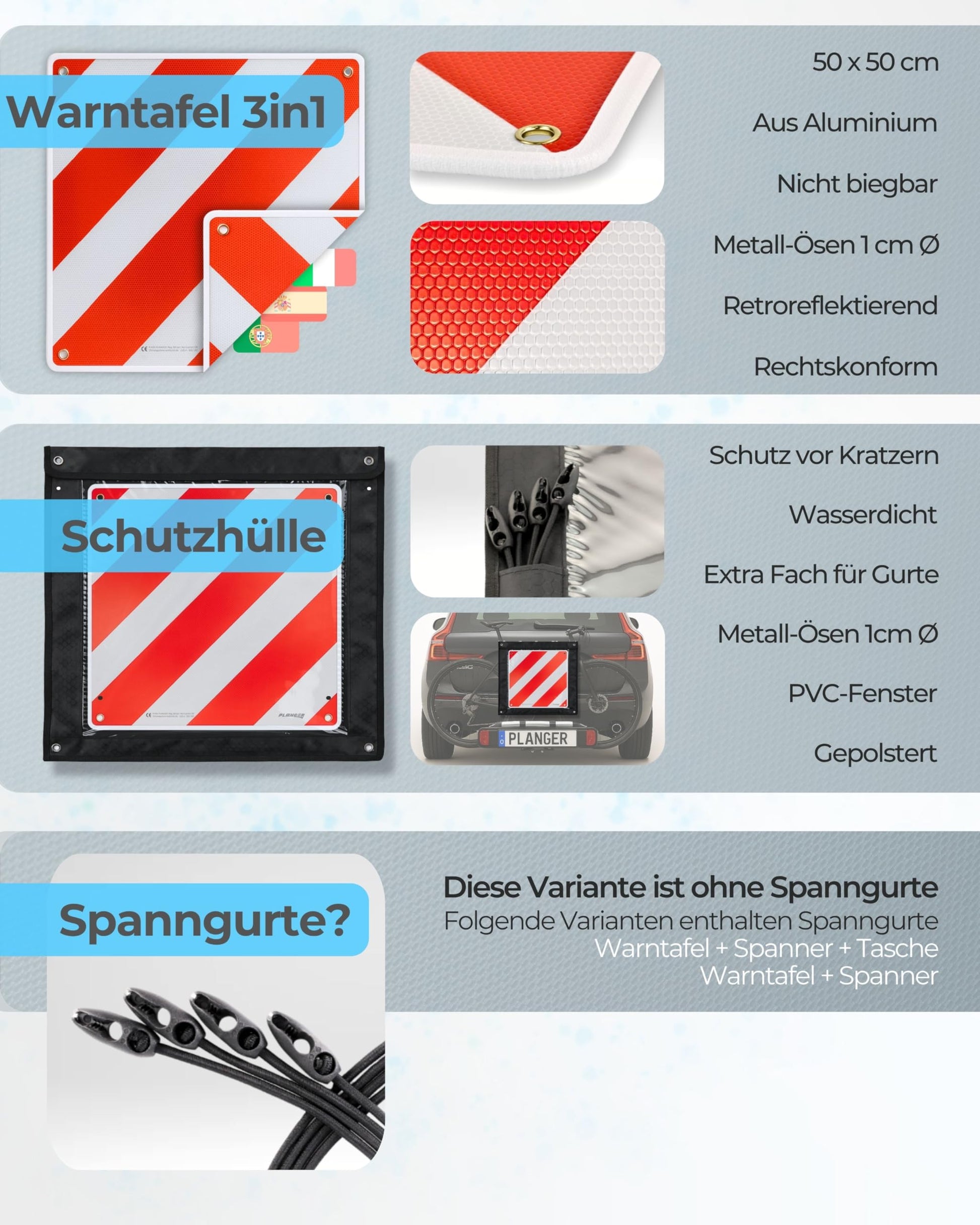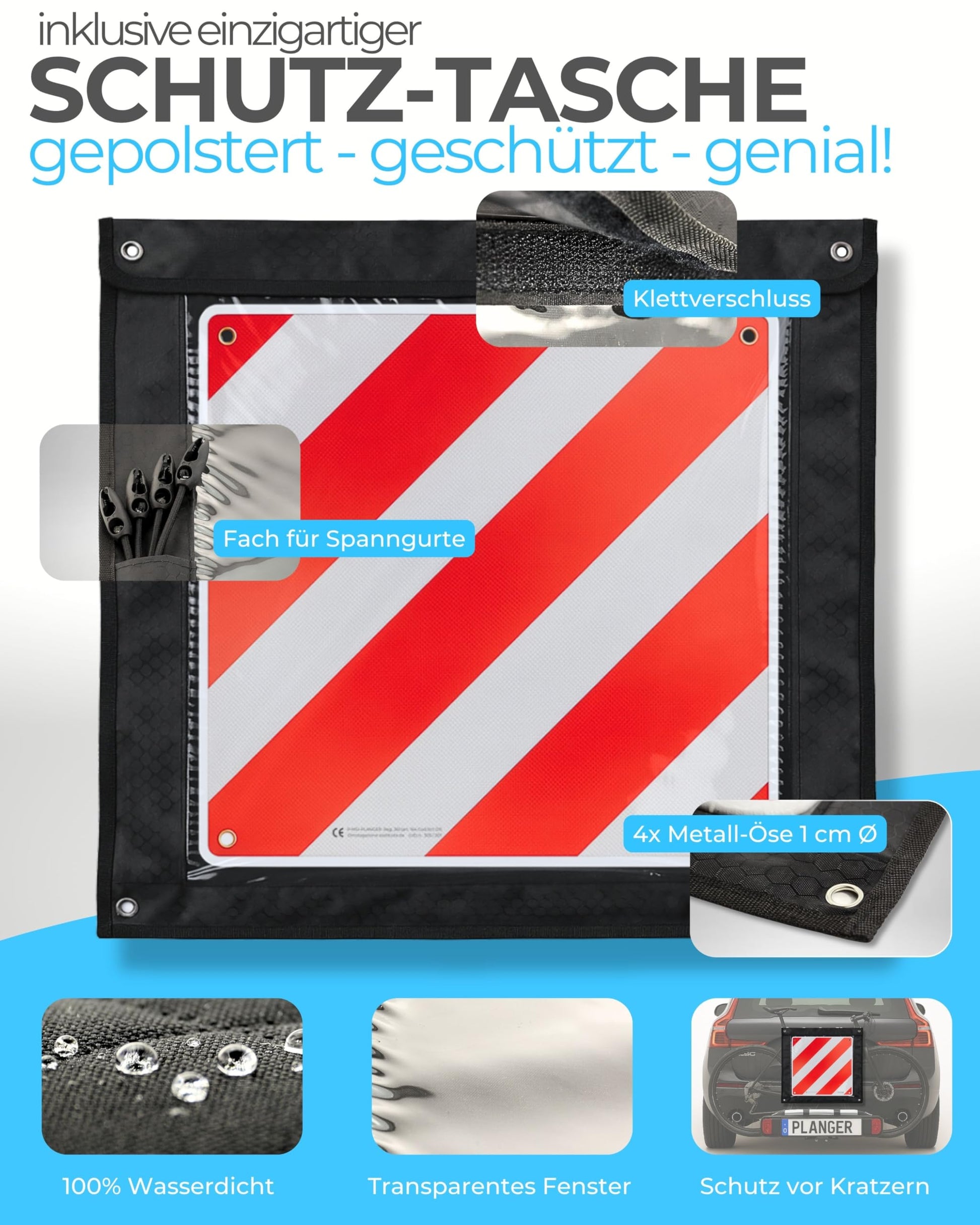 PLANGER® - Warning sign Italy and Spain & Portugal 3in1 (50 x 50 cm) (sign + bag) - Reflective warning sign red white for rear carriers and bike racks