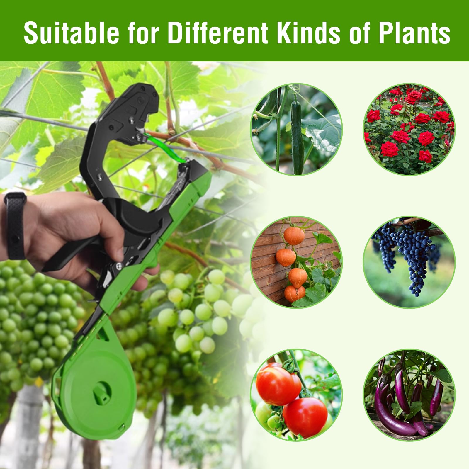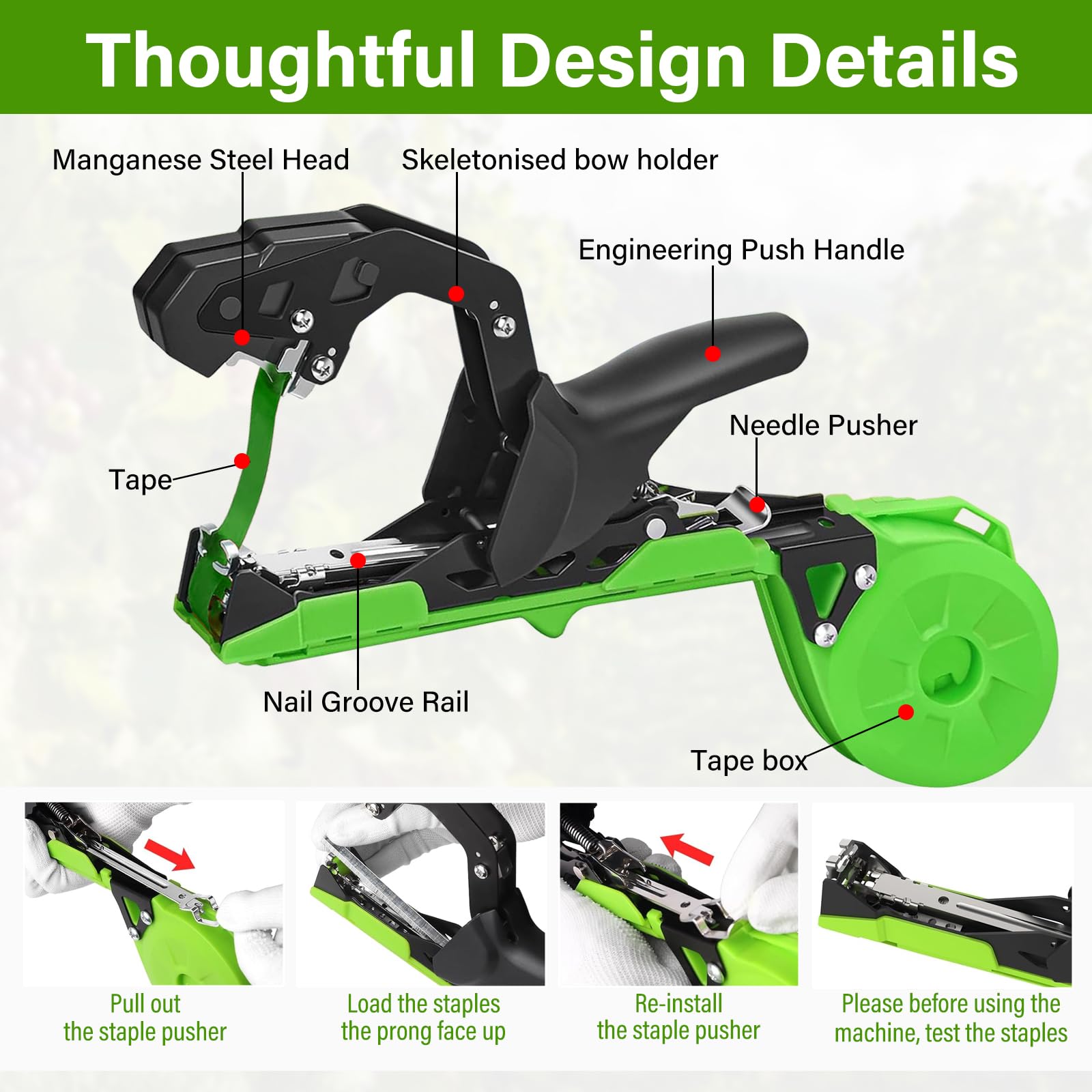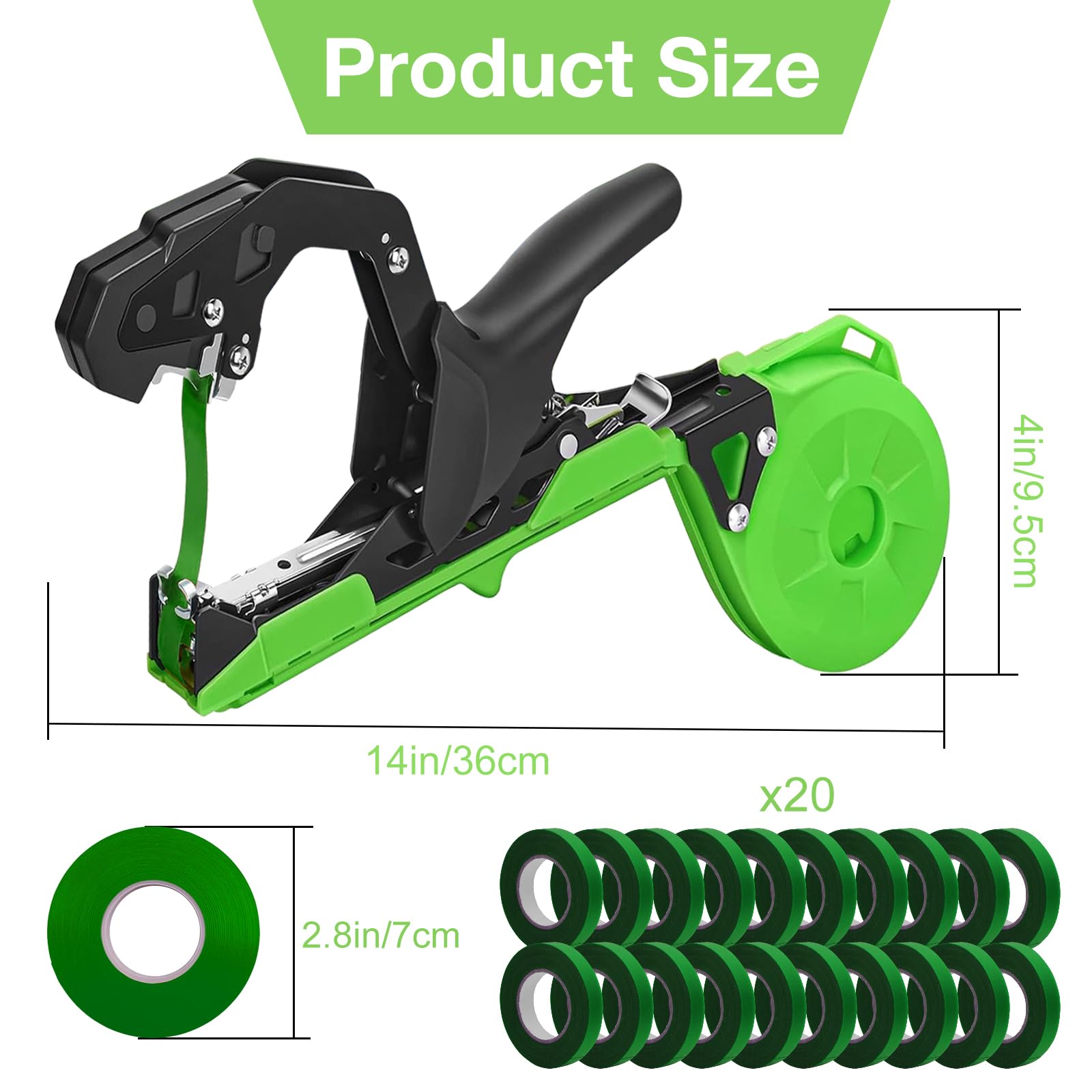 ["🍏【Save more time and work】Our plant tying machine has a 45mm opening for wider use on thicker branches. At just 420 grams, it is also easy for women and children to operate. It is lighter than traditional vine tying machines and saves up to 50% of working time.", "🍓【Protect healthy plant growth】With this plant tying machine and the included ties, you can tie plant stems to a support frame or stake with just one hand, keeping the plant upright and preventing it from tipping or breaking due to wind or gravity, protecting the plant's healthy growth.", "🍐【Easy to use】This garden tape gun machine is designed with a non-removable pressure pin. Visible nail slots make it easier to place and dispense garden nails. In addition, the secure band box will not fall off.", "🍎【Package includes】1 x plant tape gun, 20 rolls of plant tape, 10000 staples, no need to buy accessories separately. Everything you need to fulfill your gardening needs completely.", "🍈【Wide application】The gardening tool is suitable for tomatoes, grapevines, pumpkins, and many other plants to meet your gardening needs."]