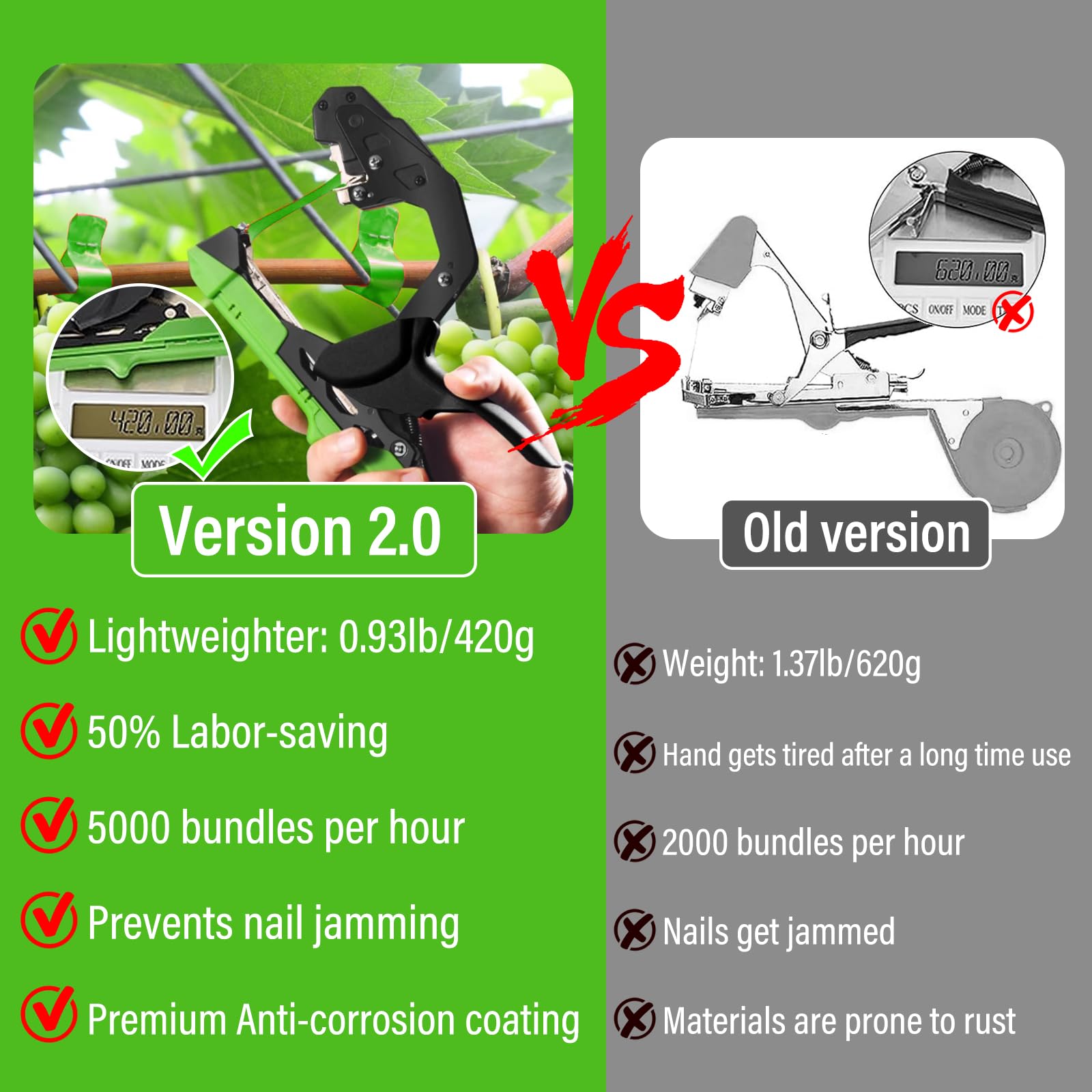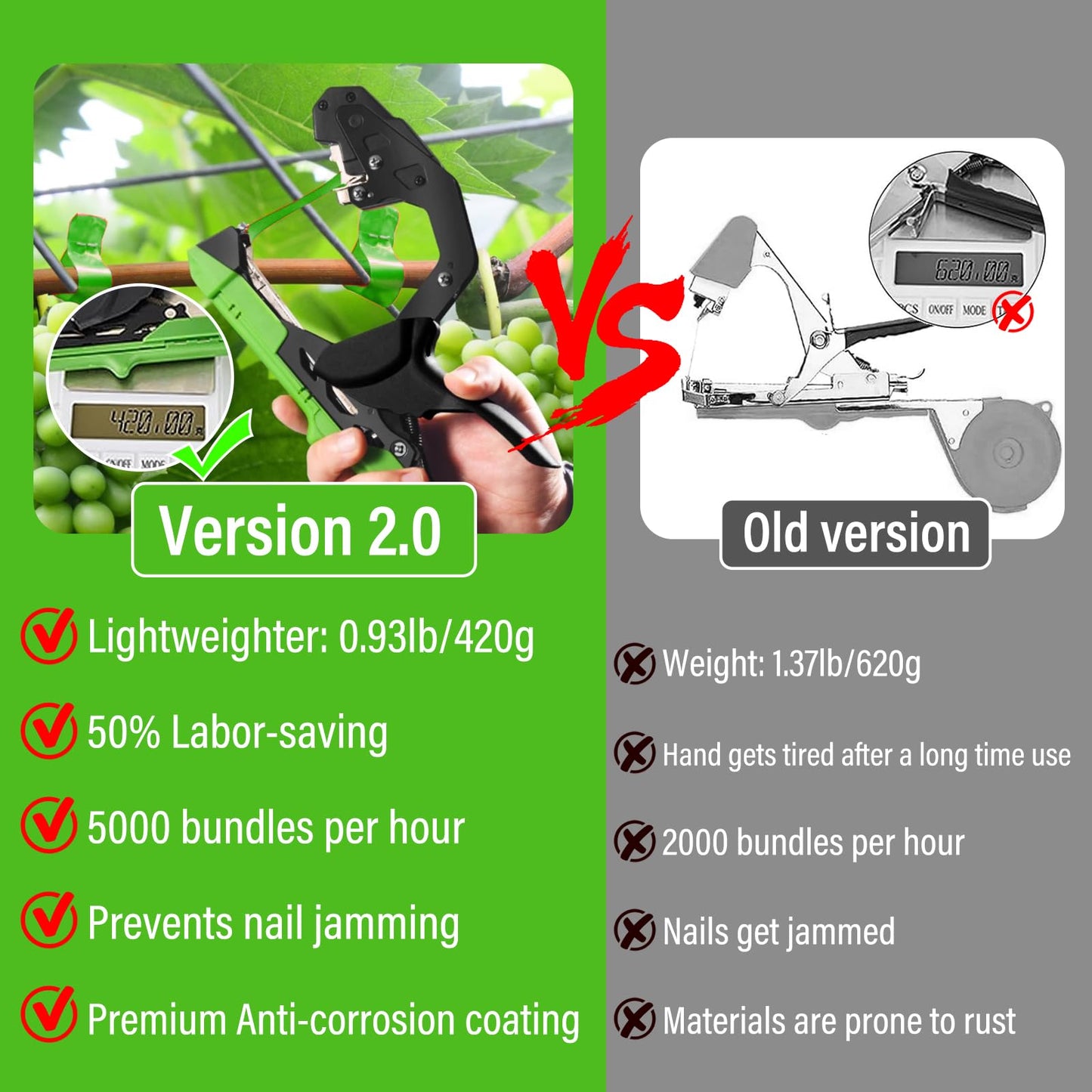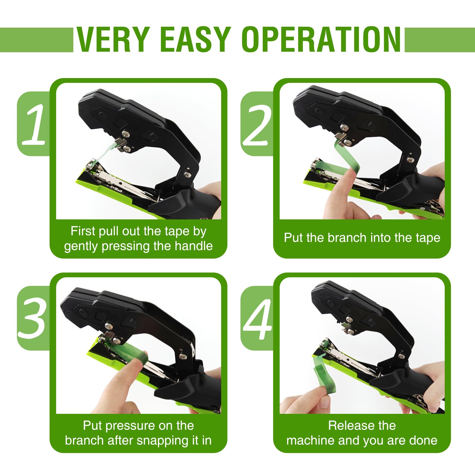 ["🍏【Save more time and work】Our plant tying machine has a 45mm opening for wider use on thicker branches. At just 420 grams, it is also easy for women and children to operate. It is lighter than traditional vine tying machines and saves up to 50% of working time.", "🍓【Protect healthy plant growth】With this plant tying machine and the included ties, you can tie plant stems to a support frame or stake with just one hand, keeping the plant upright and preventing it from tipping or breaking due to wind or gravity, protecting the plant's healthy growth.", "🍐【Easy to use】This garden tape gun machine is designed with a non-removable pressure pin. Visible nail slots make it easier to place and dispense garden nails. In addition, the secure band box will not fall off.", "🍎【Package includes】1 x plant tape gun, 20 rolls of plant tape, 10000 staples, no need to buy accessories separately. Everything you need to fulfill your gardening needs completely.", "🍈【Wide application】The gardening tool is suitable for tomatoes, grapevines, pumpkins, and many other plants to meet your gardening needs."]