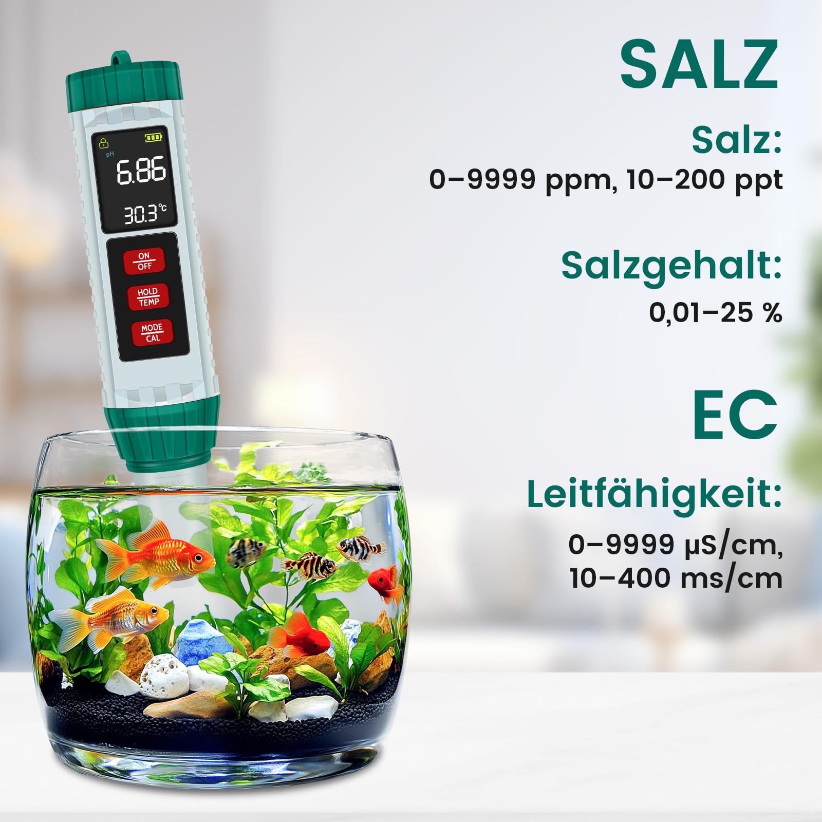 "Multifunctional 5-in-1 pH meter: This water tester measures pH value, salinity, EC, TDS, and temperature. Simply press the button (MODE/CAL) to switch and read the values. Hold the HOLD/TEMP button to switch between Celsius and Fahrenheit. This not only meets your various water testing requirements, but also saves you time, making this pH meter a helpful water testing kit for your water quality.