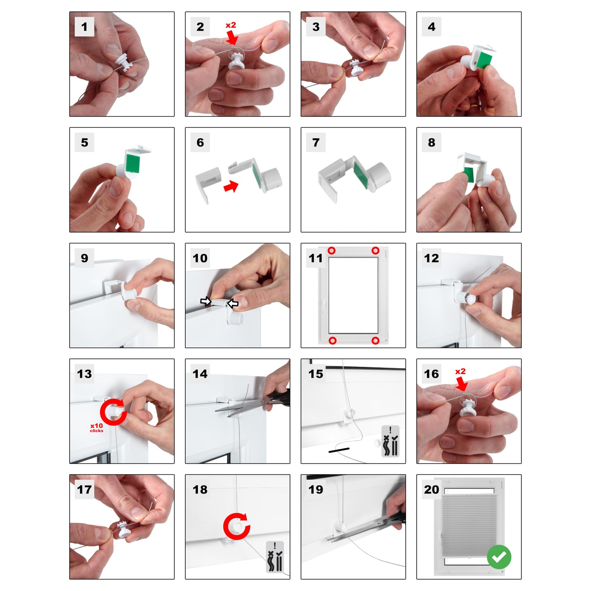 [""]"HIGH-QUALITY FABRIC - The pleated blind without drilling is made of a solid fabric that does not darken the room completely or let in too much sunlight; thus privacy is optimally protected. The pleated blind can be adjusted from the top and bottom.","π¨ MOUNTING WITHOUT DRILLING - Thanks to the adjustable hooks, our pleated blinds for windows can be attached to the window frame without drilling; no tools required - ideal for rental apartments. The hook allows for length adjustment and tensioning of the cords. The pleated blinds fit window sashes with a profile thickness of 15 to 23 mm. The blinds do not fit roof windows, sliding windows, or wooden windows.","π¨ HUGE COLOR SELECTION - The clamp blinds for windows without drilling are available in 10 different colors; thus they fit in every living room, bedroom, study, or children's room.","π EASY WINDOW MEASUREMENT - Measure the width of the window pane and add 4 cm. To determine the height, measure the total height of the window sash. Example: Your window has dimensions of 41 x 110 cm, choose the blind with 45 cm width and 120 cm height","π MADE OF MOISTURE-RESISTANT POLYESTER - The fabric in each clamp blind without drilling repels moisture - making it easy to clean and can be used in the bathroom or kitchen. Suitable for windows or balcony doors.","π£ NEW VERSION - Due to updates and improvements, there have been minor changes to our products. These changes do not affect the quality or functionality of the pleated blinds. All changes have been made to increase the versatility of the product and make installation easier."