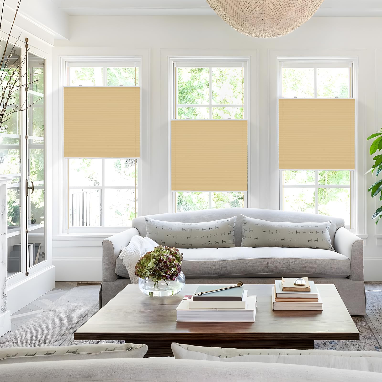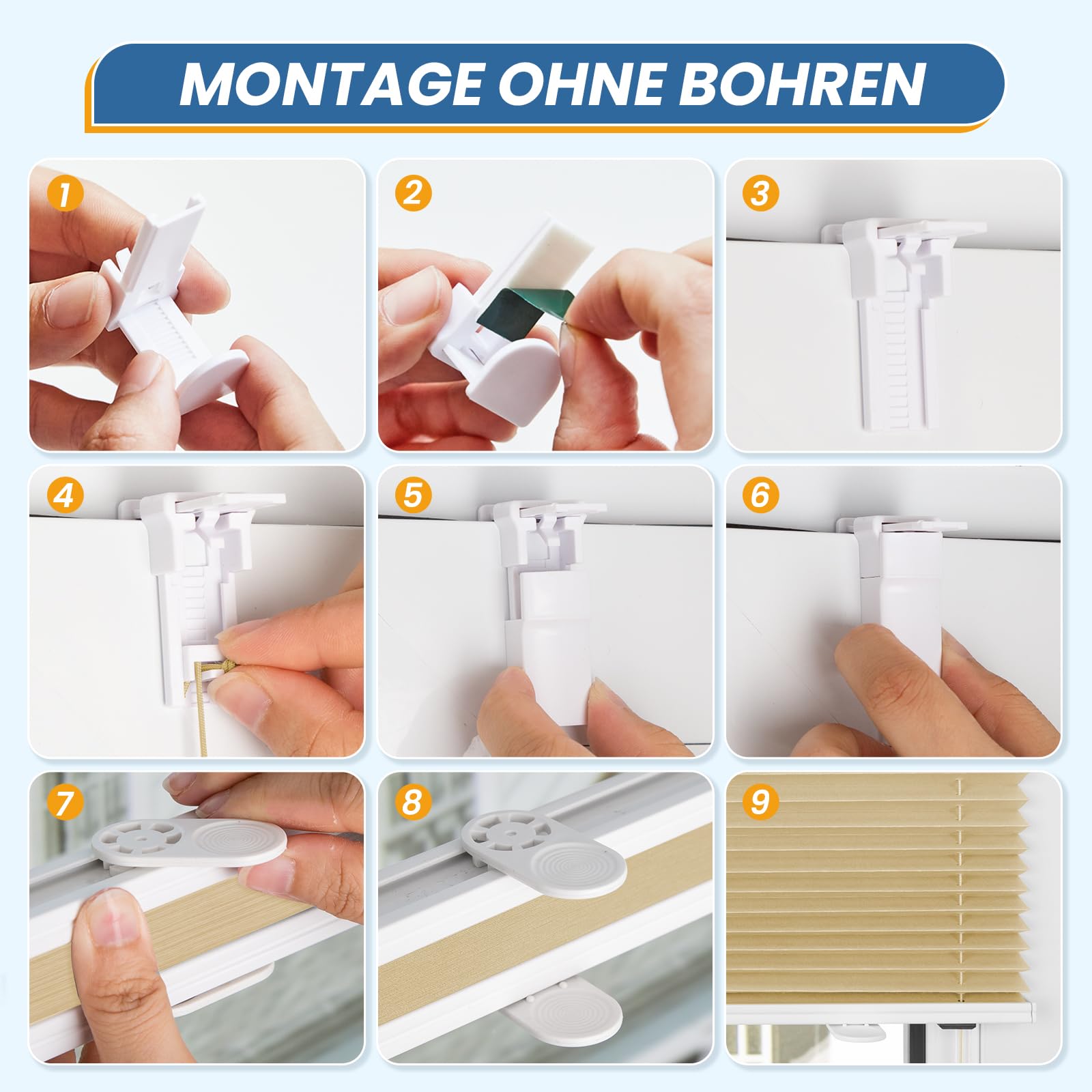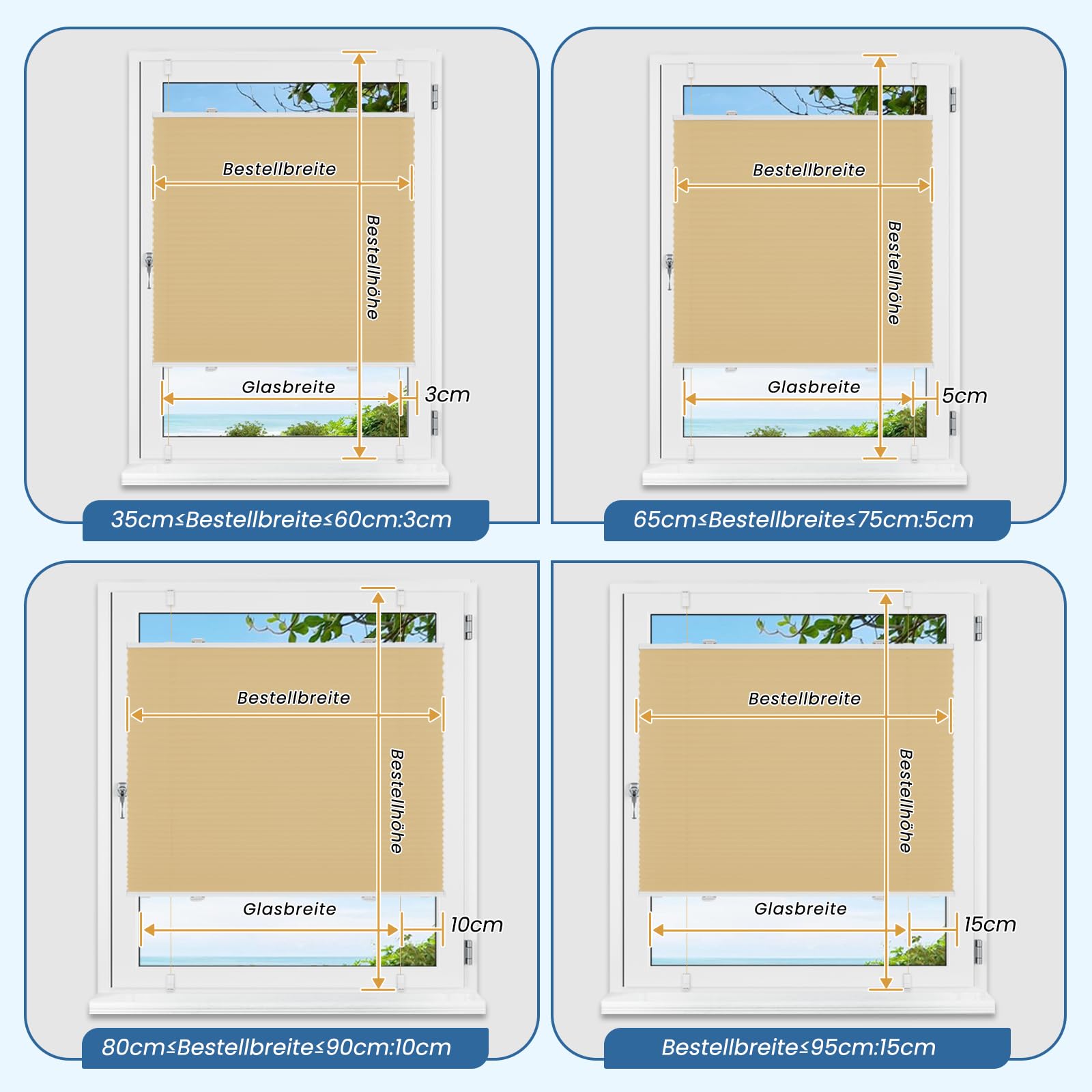 ["Light-filtering but privacy-protecting: Pleated blinds without drilling are made of 100% polyester, durable and easy to care for. Pleated blinds are opaque, but do not completely block out the light, allowing natural light to filter through and provide you with the best visibility and glare protection. The darker the color, the better the shading performance.","Easy installation: The pleated blinds can be mounted without drilling and can be easily clamped to the window frame with 4 clip holders. Suitable thickness of the window frame: 10-23mm. Please note that blinds are not suitable for skylights, wooden windows, tilt windows, sliding windows, and fixed windows.","Flexible application: You can freely adjust the position of the blinds with the cord and 2 handles, and the blinds can be secured at any position on the window. Blinds are ideal for living rooms, offices, commercial spaces, kitchens, children's rooms, bathrooms, studies, balcony doors, patio doors, etc.","Size measurement: Please measure the width of the glass before purchasing. We recommend ordering pleated blinds that are 4 cm wider than the width of the window pane. Therefore, order width = glass width + 4cm, order height = height of the entire window frame. But be careful: Do not exceed the handle.","Important: As the width of the fabric increases, the cords of the blinds gradually shift towards the center. Order width 35cm-60cm: Distance between cord and frame is 3cm; Order width 65cm-75cm: Distance between cord and frame is 5cm; Order width 80cm-90cm: Distance between cord and frame is 10cm; Order width greater than 95cm: Distance between cord and frame is 15cm"]