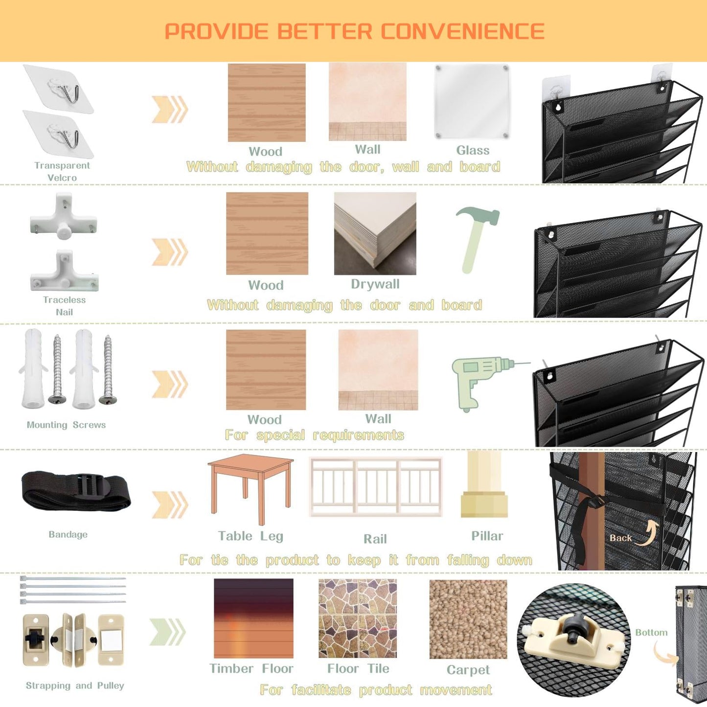 "π Practical: Wall organizer allows you to easily access the contents. Our document wall organizer comes with wheels, mounting screws, label paper, nylon straps, and transparent Velcro closure, which can be easily attached to the wall or board (such as: door cabinet, etc.)"