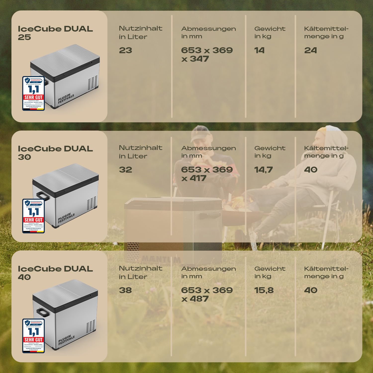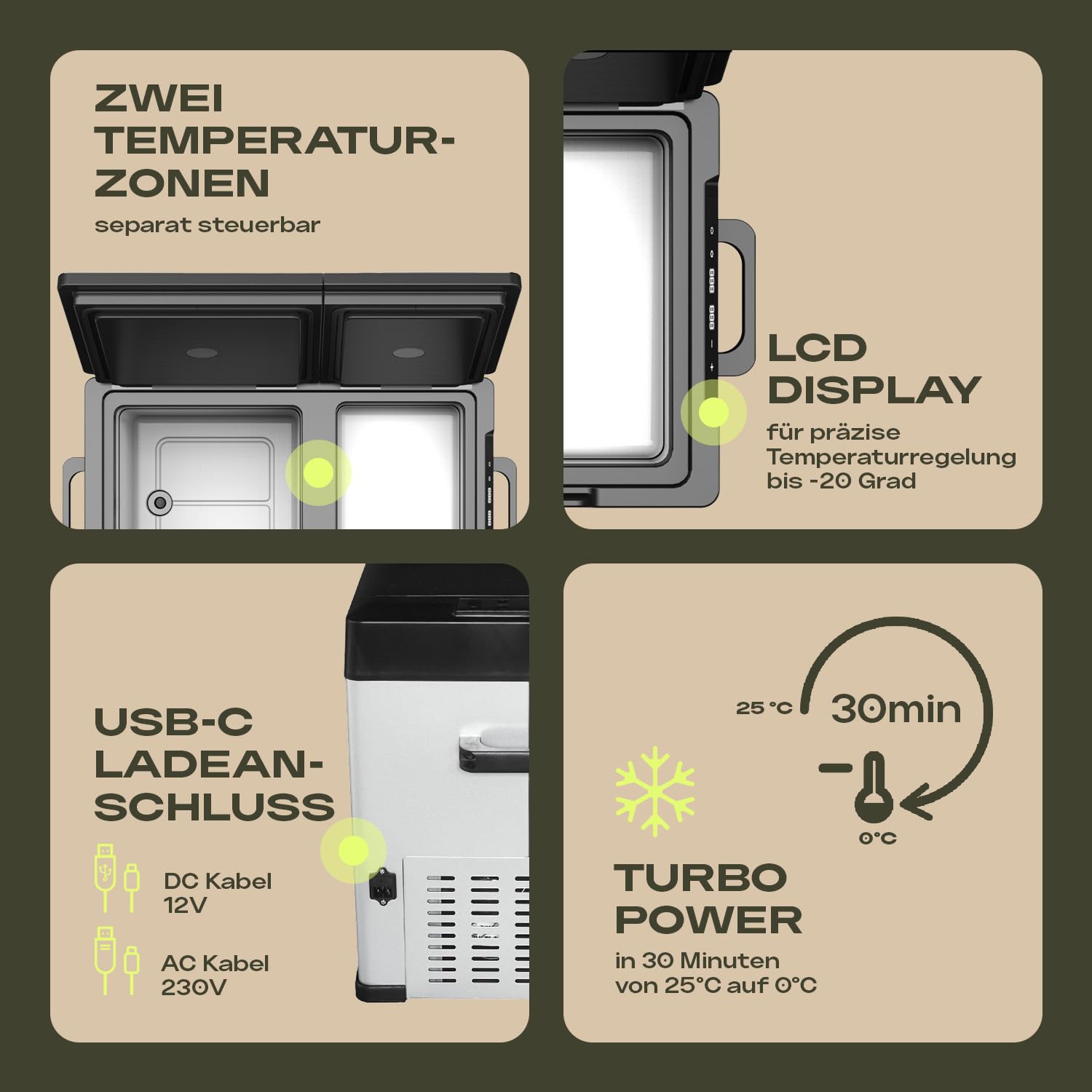 ["✅ Quiet cooling on the go & at home: The qAIR system ensures whisper-quiet operation – ideal as a compressor cooler in the car, camping, or at the festival.", "✅ Two cooling zones, separately adjustable: Keep beverages and food perfectly tempered on two individually adjustable cooling areas with the powerful camping cooler.", "✅ Flexible use from +20°C to -20°C: The IceCube DUAL compressor refrigerator adapts – whether as a freezer box for the car or as a cooler for home or outdoor use.", "✅ Control via app and LC display: The electric cooler can be conveniently operated via smartphone or directly on the display – full control over both cooling zones.", "✅ Robust, elegant & travel-friendly: Shatterproof glass elements and metal body make this 40L cooler ideal for car, camper, festival, or campsite."]