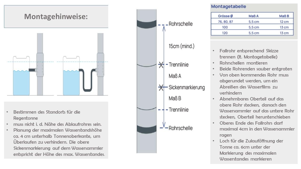 ["No overflow of the rain barrel - The water collector keeps the barrel filled to the desired level.","Automatic filling of the barrel as soon as the water level drops below the fill height.","Up to 85% of the rainwater collected is redirected into the barrel.","Easy to install and clean with a sliding piece.","Frost-proof: Removing the rainwater collector is not necessary in winter.","Rain barrel should be emptied and hose removed in winter.","Comes with hose connection set consisting of: 350mm flexible hose and barrel connection."]