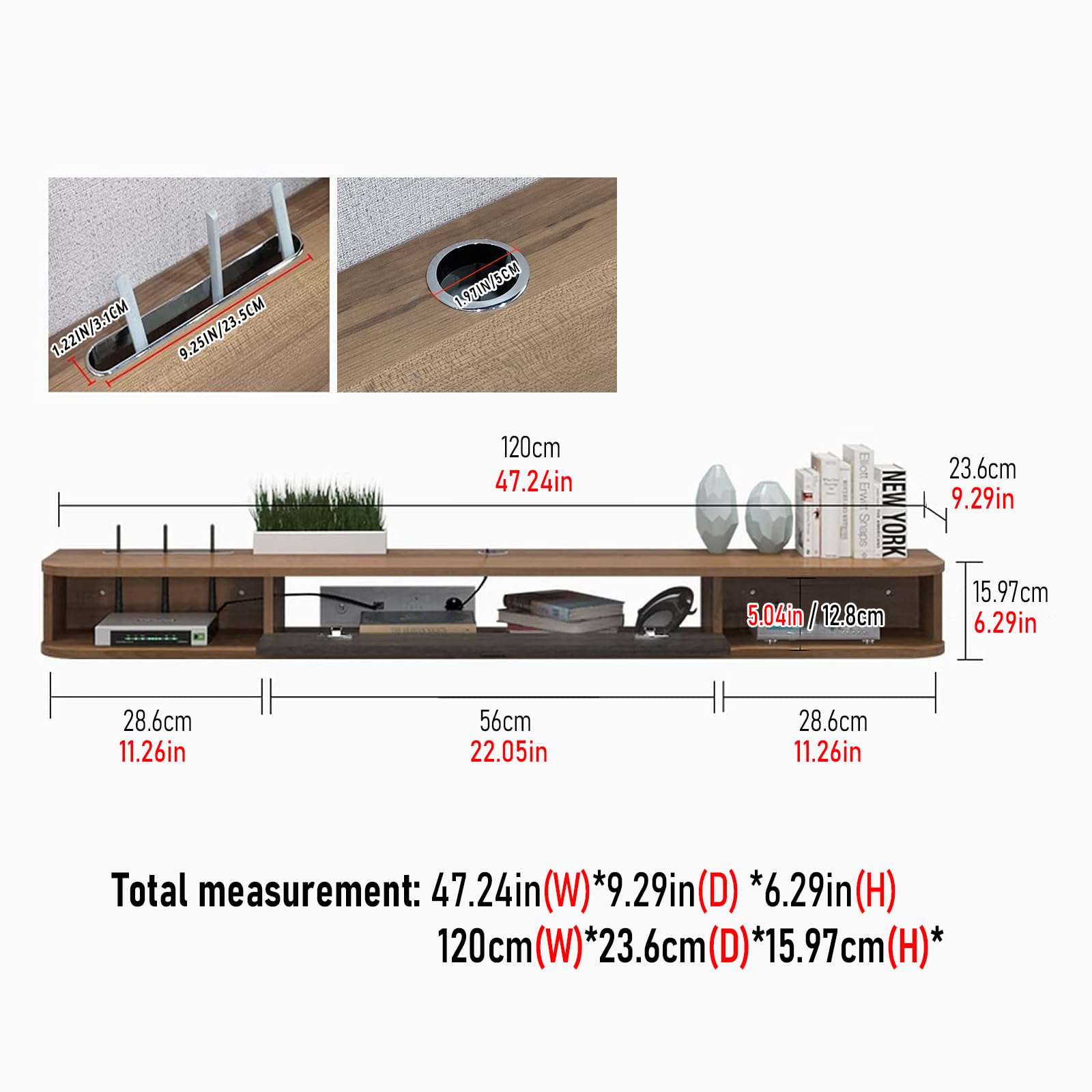 "[Wire Management] Our floating media console with cable holes helps you get rid of messy cables. The 2 cable holes at the top and bottom for hiding wires keep your things neatly organized and within reach."