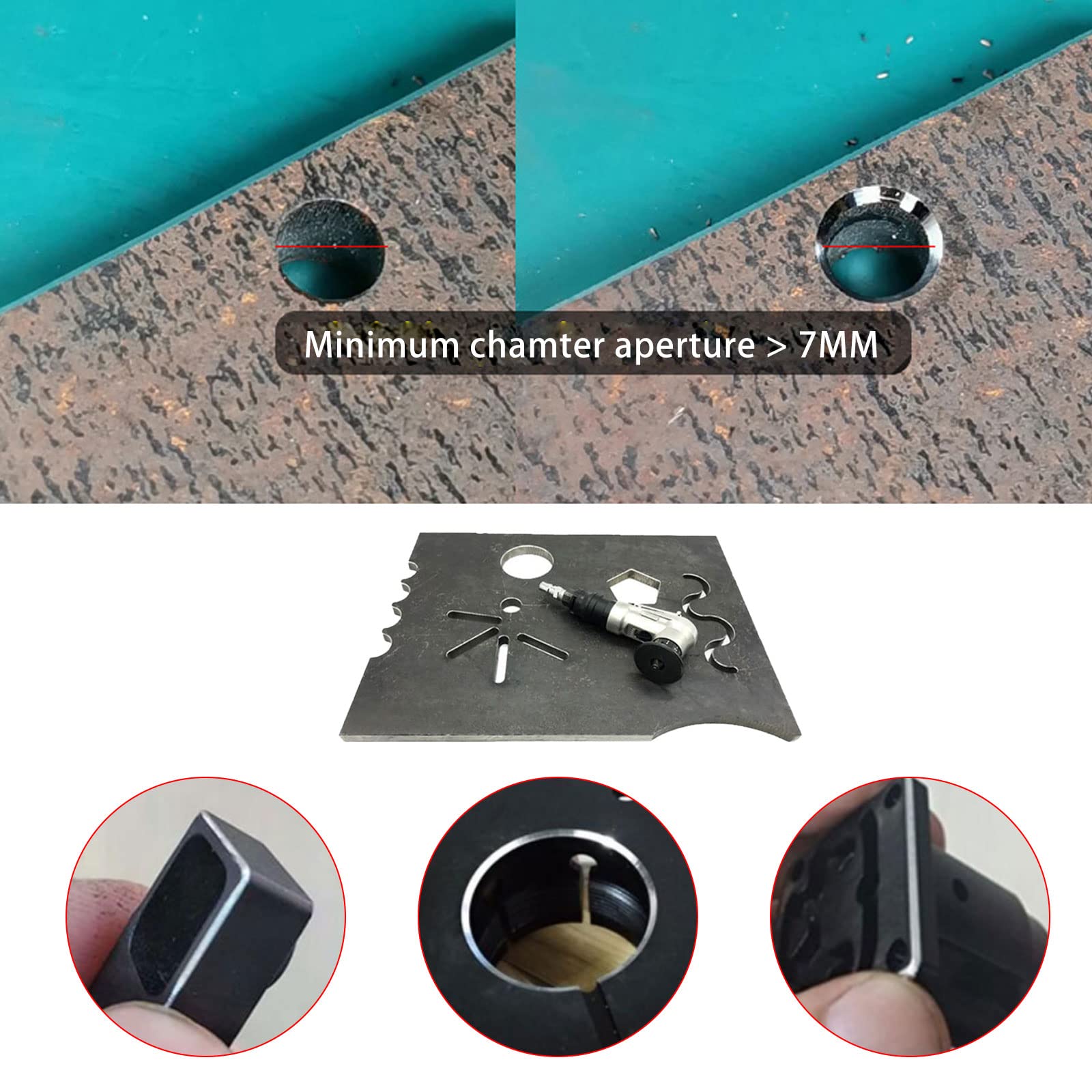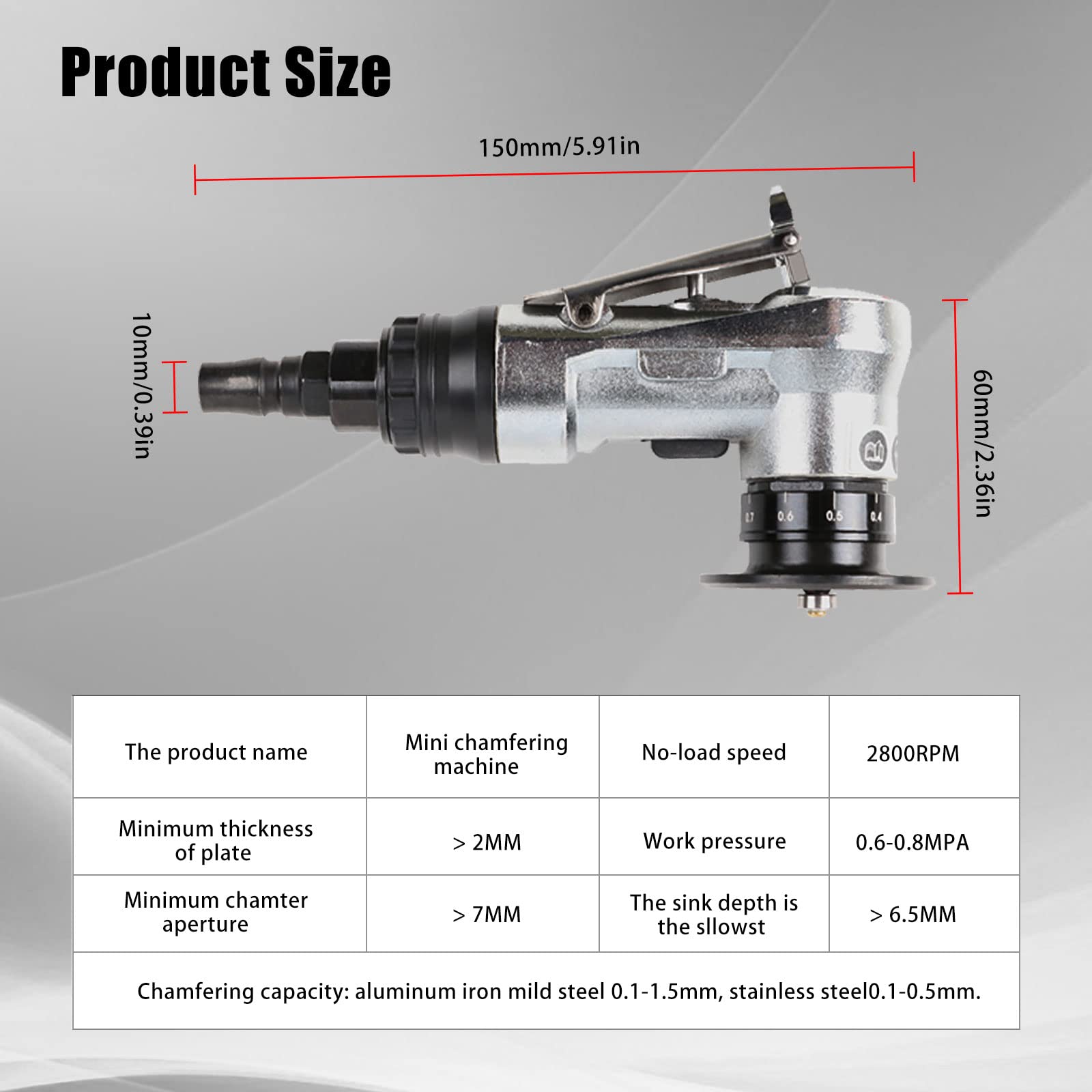 ["【High-quality Materials】Due to the use of high-quality imported components, the pneumatic chamfering machine makes assembly more precise, stable performance, rugged and durable, and has a long service life. Loosen the screw, rotate to select the scale size, and tighten the screw.","【High Stability Performance】Supports the grinding function when chamfering tight spaces. The chamfering machine is equipped with a small-diameter grinding wheel, which helps maintain high performance for a long time. Five-speed air inlet adjustment and air inlet size can be adjusted as desired.","【Humanized Design】This small grinder has a lightweight and comfortable ergonomic design, small size, light weight, low vibration, and easy grip. Lightweight body, easy one-handed operation, quick cutting of straight and round edges.","【Portable】It can greatly improve work efficiency, that the elbow design of the angle cutting tool is lightweight and easy to use. Equipped with a 360-degree rotatable exhaust port, which can quickly discharge and reduce the machine's temperature.","【Widely Used】Suitable for small jobs and hard-to-reach areas, suitable for light grinding, spring chamfering, and rust removal, providing versatility for any task at hand."]