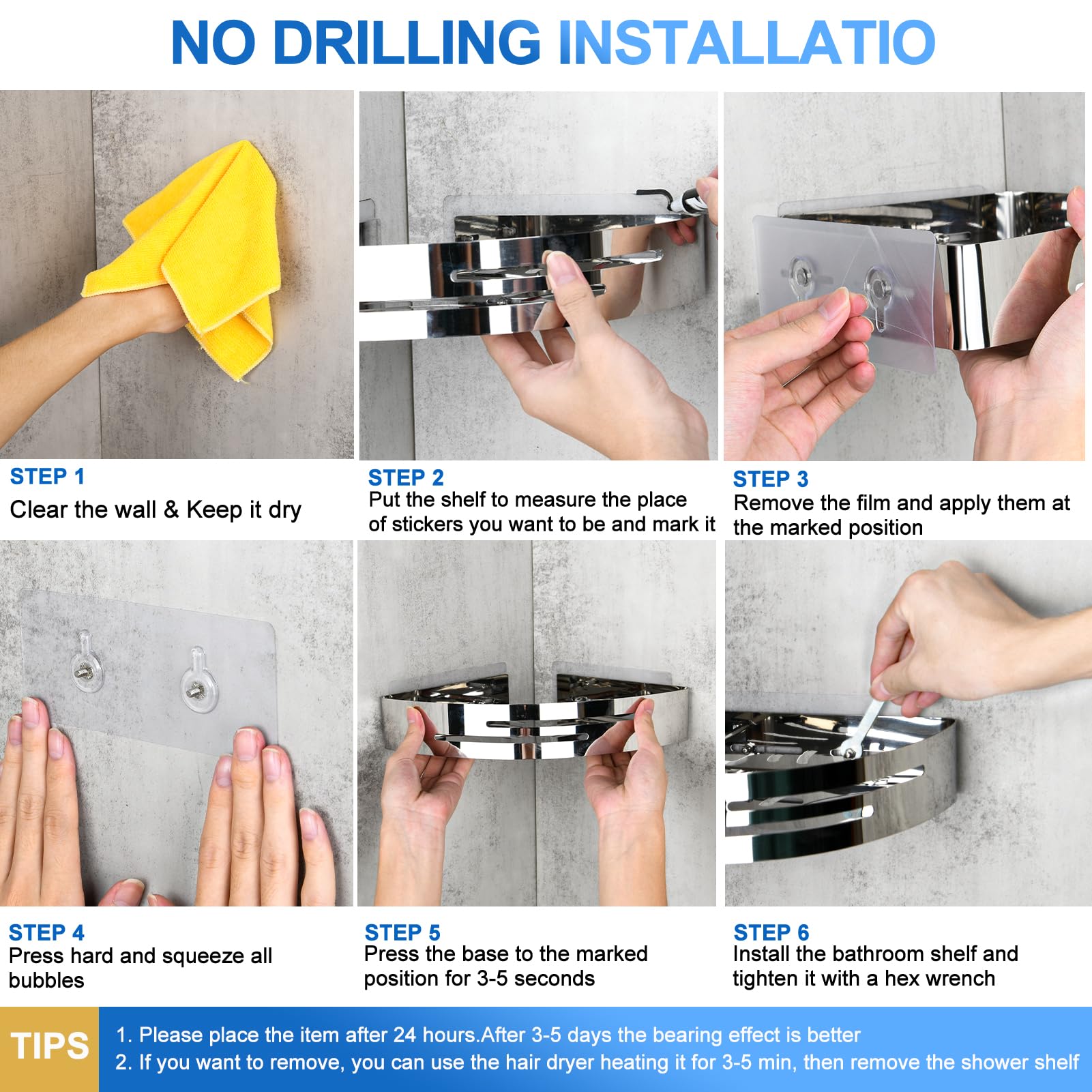 "Corner Shower Caddy Without Drilling: our shower shelf can be easily and quickly installed using our special adhesive system, saving you the hassle and wall damage. This will keep your bathroom organizer intact and add a modern touch."